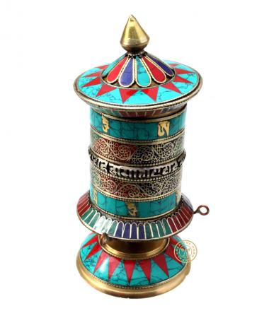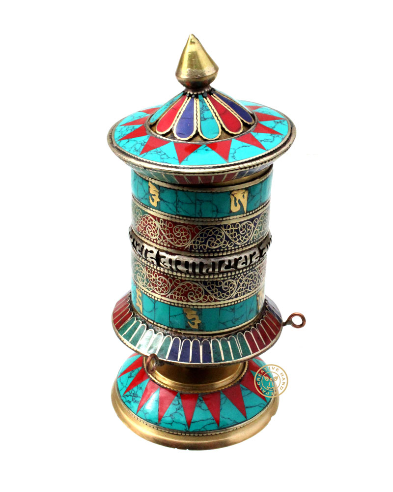 This Stone Setting Desktop Filigree Prayer Wheel is made of Copper Brass & Stone Chips. Sacred Buddhist mantras are written on a long roll of paper kept inside this wheel. This roll of mantras rotates with each rotation of this wheel. With every rotation of wheel, these mantras are believed to be recited once. It is 6 inch" tall, 3 inches wide on the top of the prayer wheel. Since the product is entirely handmade; there can be slight variations in color and size, but we always try to maintain the highest quality of our products.