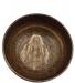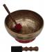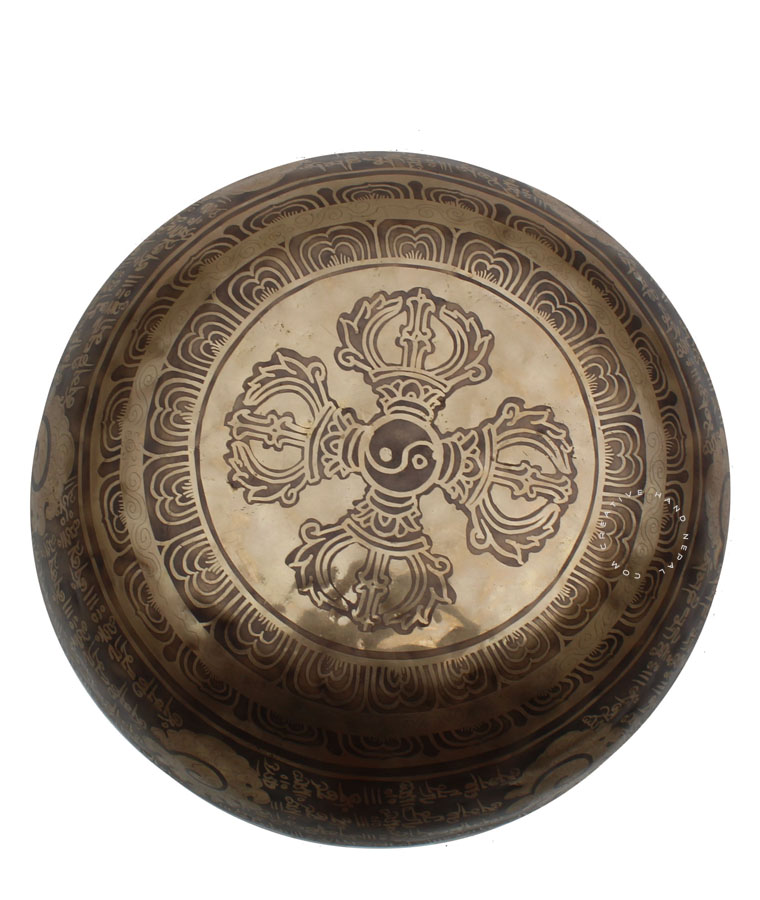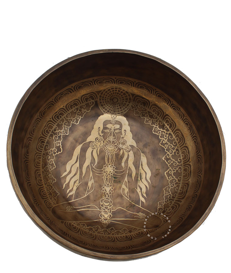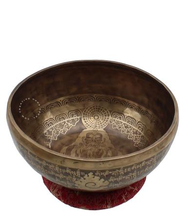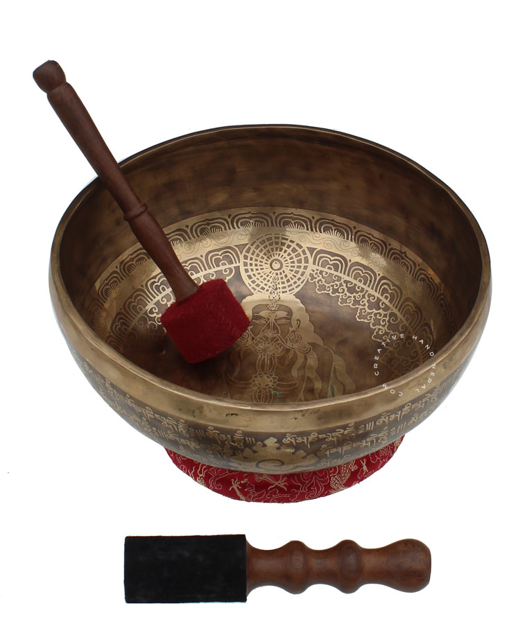 This beautiful Hand Hammered Made Five Metal singing bowl etched with the mantra, Om Mani Padme Hum, on its outside and Meditating chakra symbol Etching and carved inside  the bowl.There is also mixed small amount of seven auspicious metals (gold, silver, mercury, copper ) in this singing bowl.  Since the product is entirely handmade: there can be slight variations in color and size.