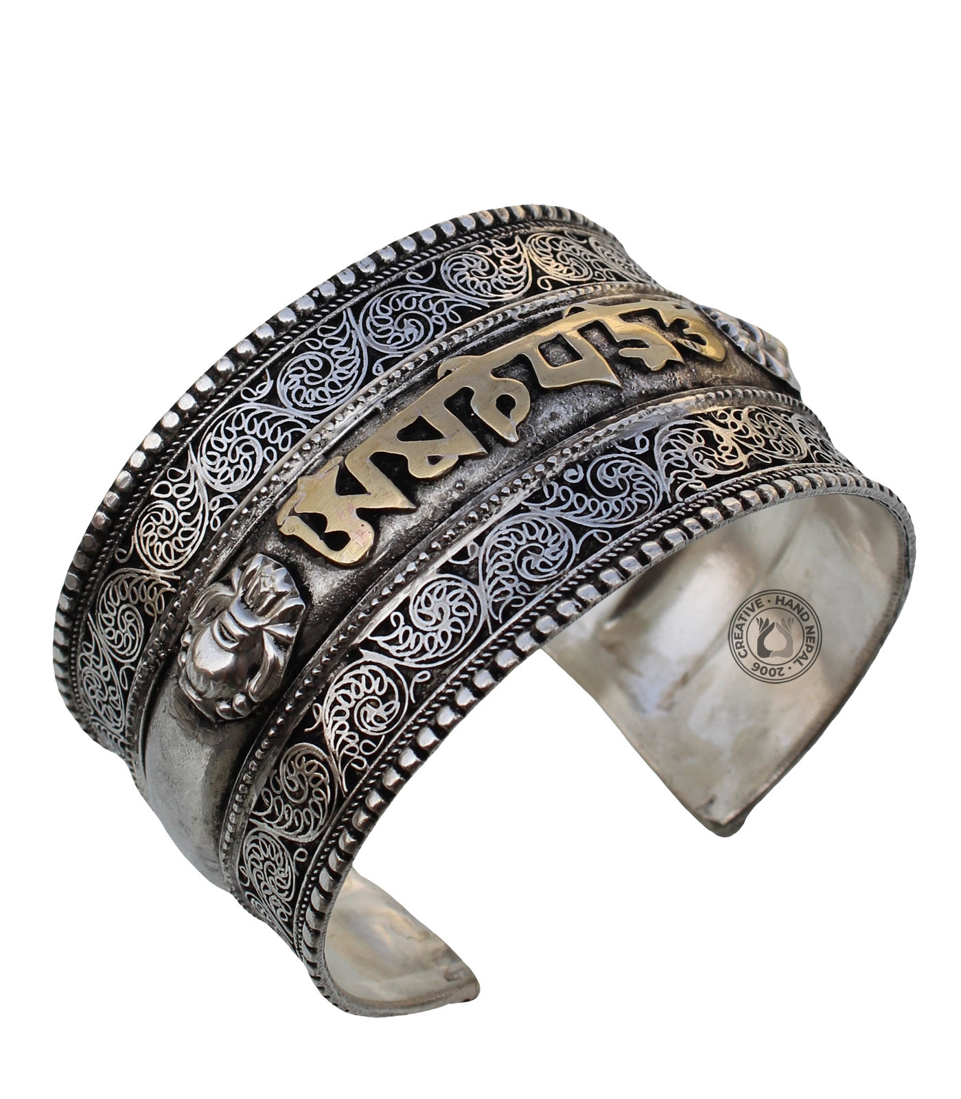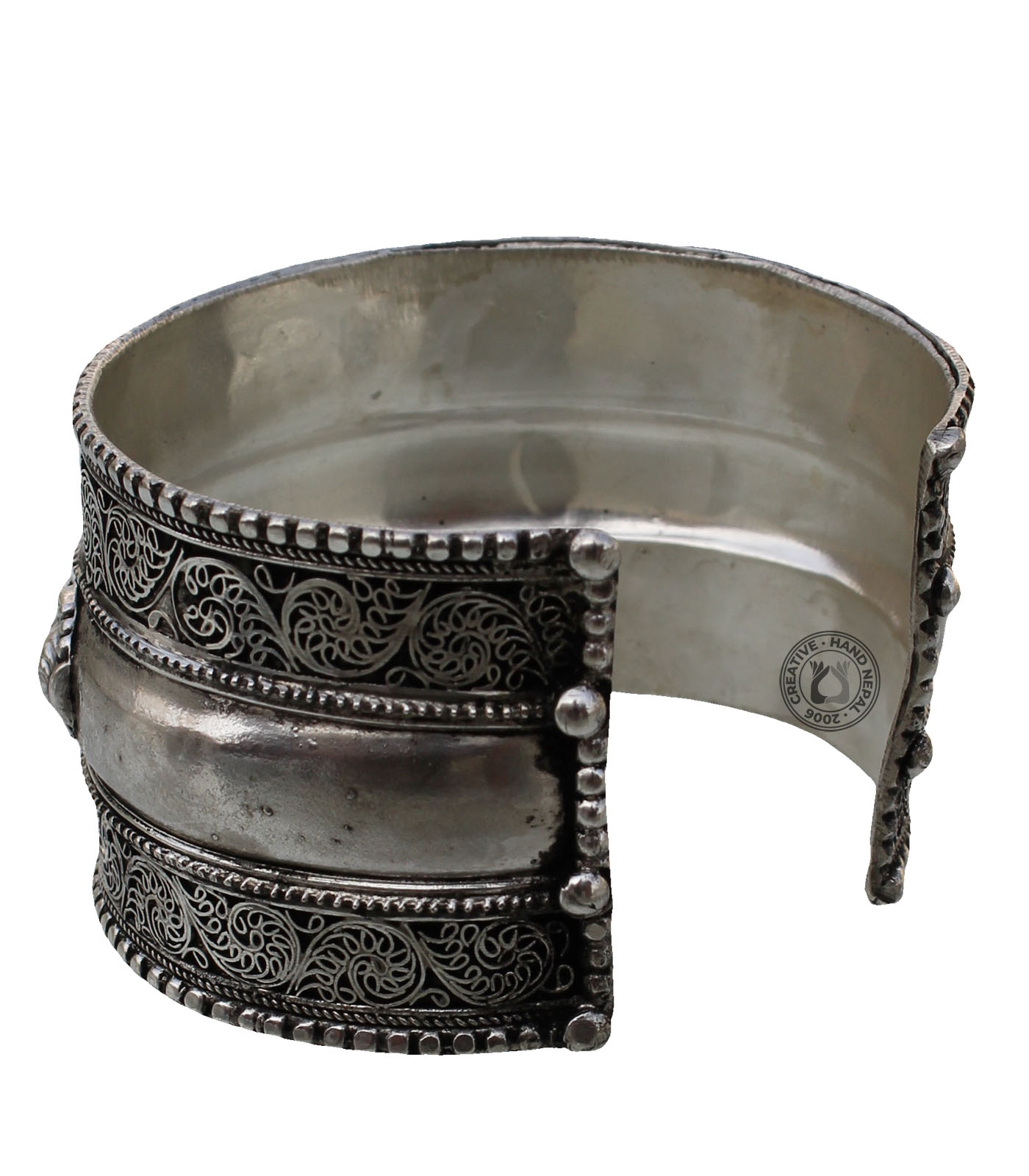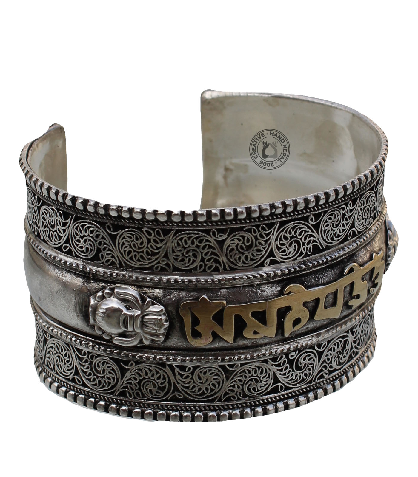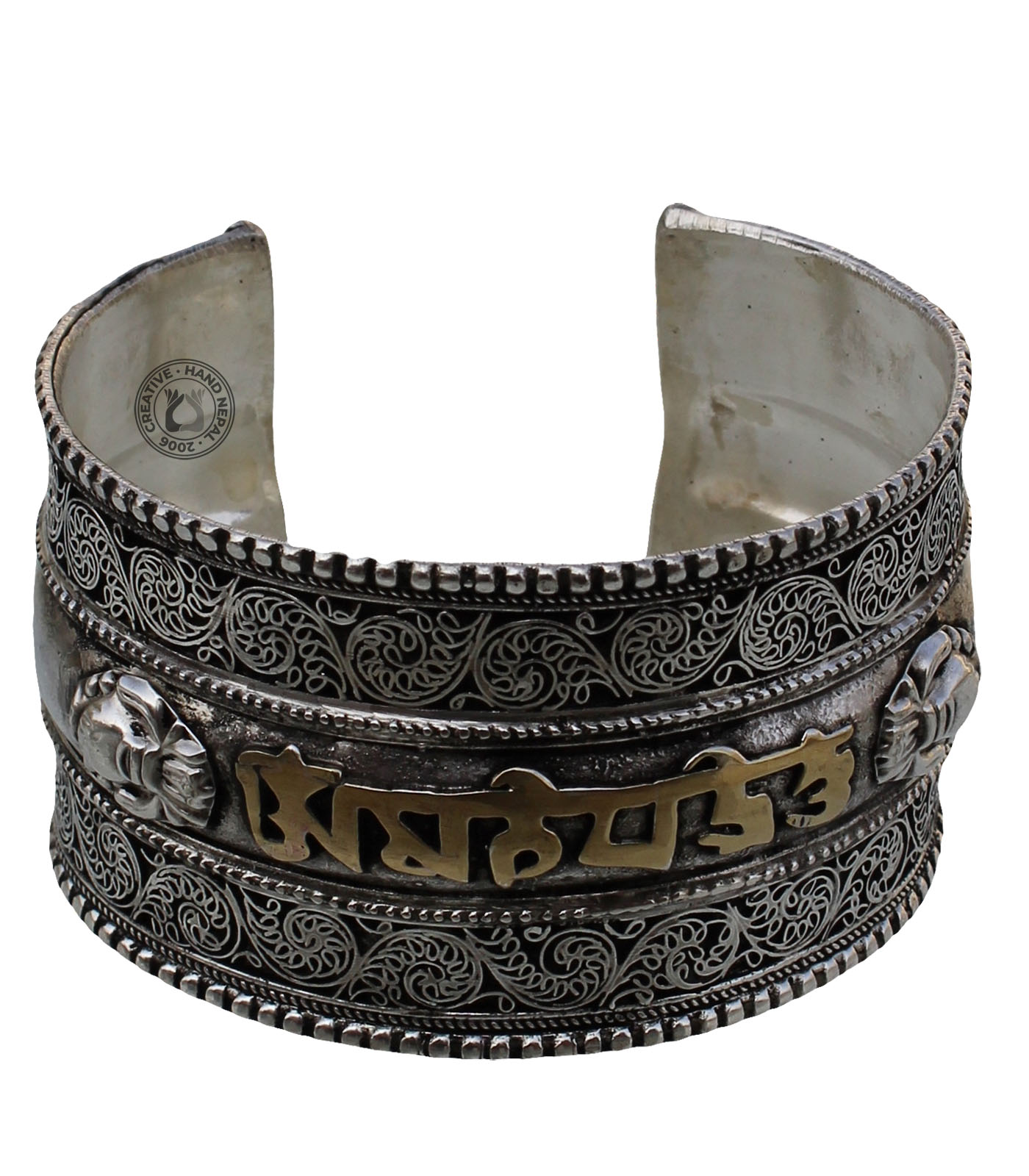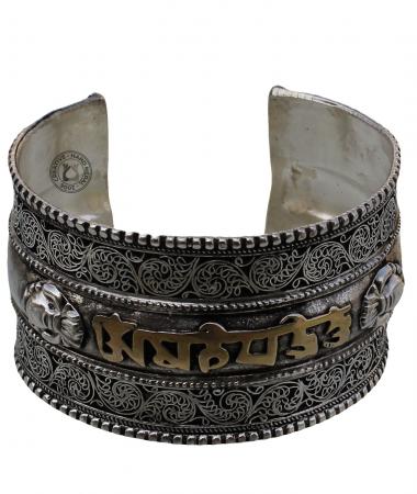Filigree is a type of jewelry-making technique that involves twisting and weaving thin metal wires into delicate, intricate patterns. Filigree bracelets can range from simple, dainty styles that are suitable for everyday wear to more elaborate, statement pieces that are perfect for special occasions. This bracelet is made from a combination of White metal and brass. Approximately 4 cm wide and 18 cm long adjustable to fit men or women