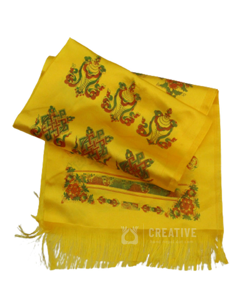 Tibetan Khata is Used in Tibetan Customs For Offerings and greeting. Whenever Tibetan People visit one another, or receive or visit a lama,  or offered to religious images, such as statues of the Buddha they offer a khata as a symbol of all things good. A nice standard coloured Khata offering scarf in Yellow with Auspicious symbols and mantras in print. Please Note The measurements and weight of Khata varies (not exactly same) because dependant on the Hand cut. The given are the approximate sizes and weight.