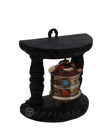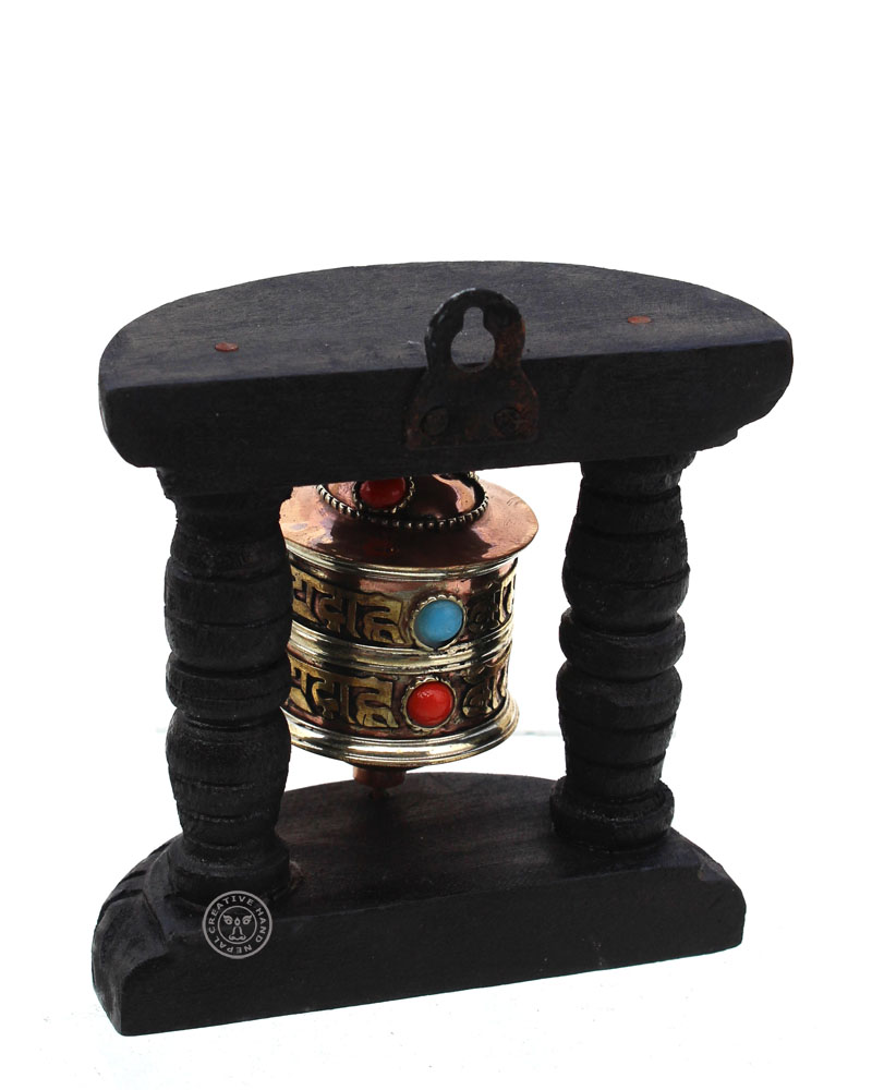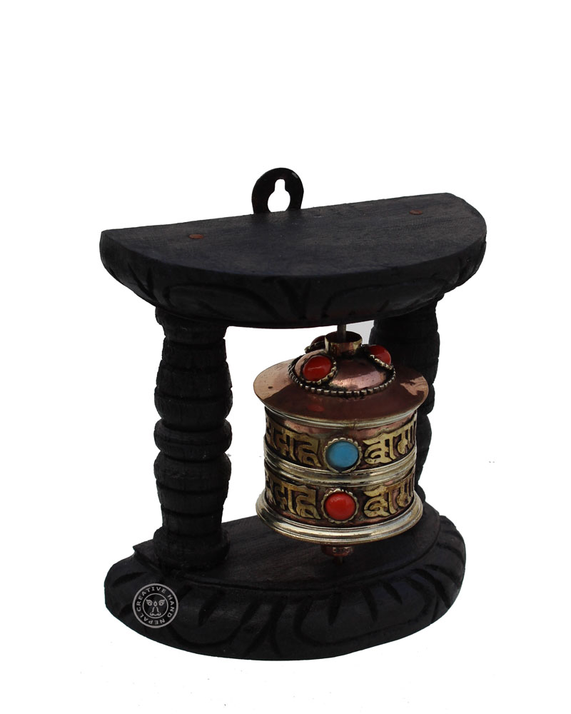 This Tibetan Buddhist wall-mounted prayer wheel is made from copper and elm wood.  The mantra sign is written around the outside of the prayer wheel and the Mantra Buddhist Symbols are written around the outside as well. There is a Tibetan Buddhist mantra written around the inside of this prayer wheel. This prayer wheel is 4 inches tall and 4 inches Length and 2inches wide. This product was individually crafted and finished. This process ensures that no two pieces are exactly alike. Variations in size, shape and finish make each piece a unique work of art.