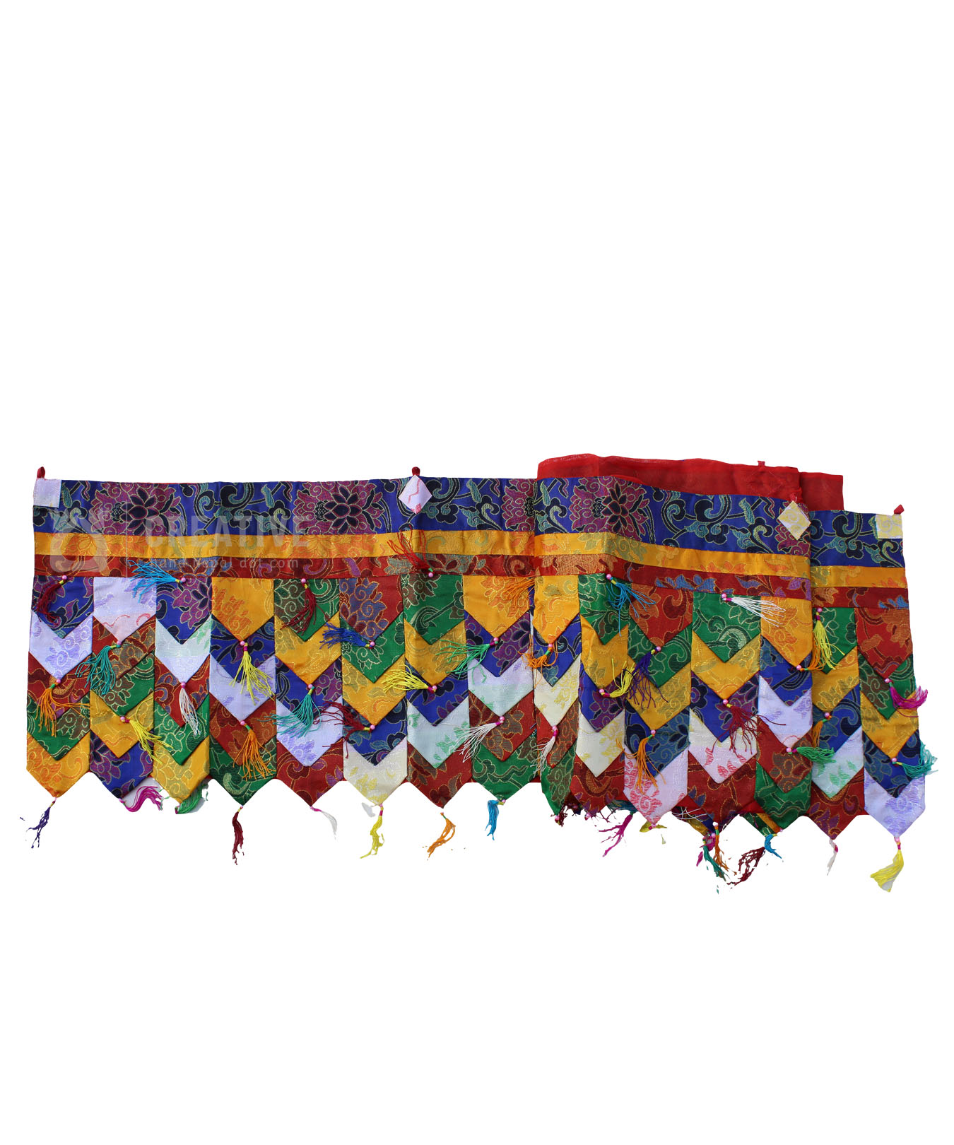 Tashi Tha-Ring Shambu Banner Hung around the perimeter of a shrine room along the ceiling. This style is often displayed outside monasteries during ceremonies, suspended between poles above the building. Tashi Tha-Ring Shambu Banner elaborate applique designed brocade. Approx 20 inch Height with fringe X 115 inch long