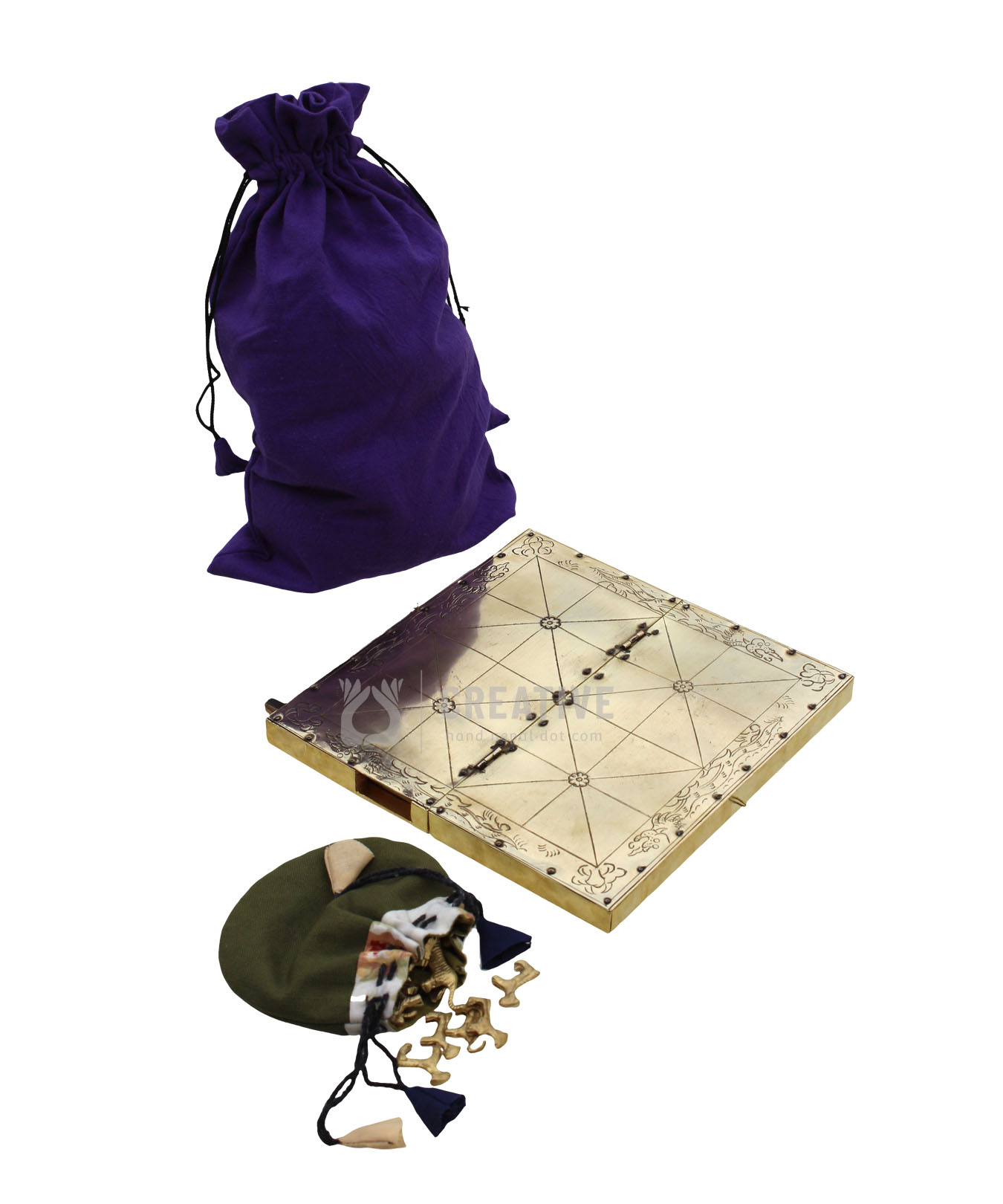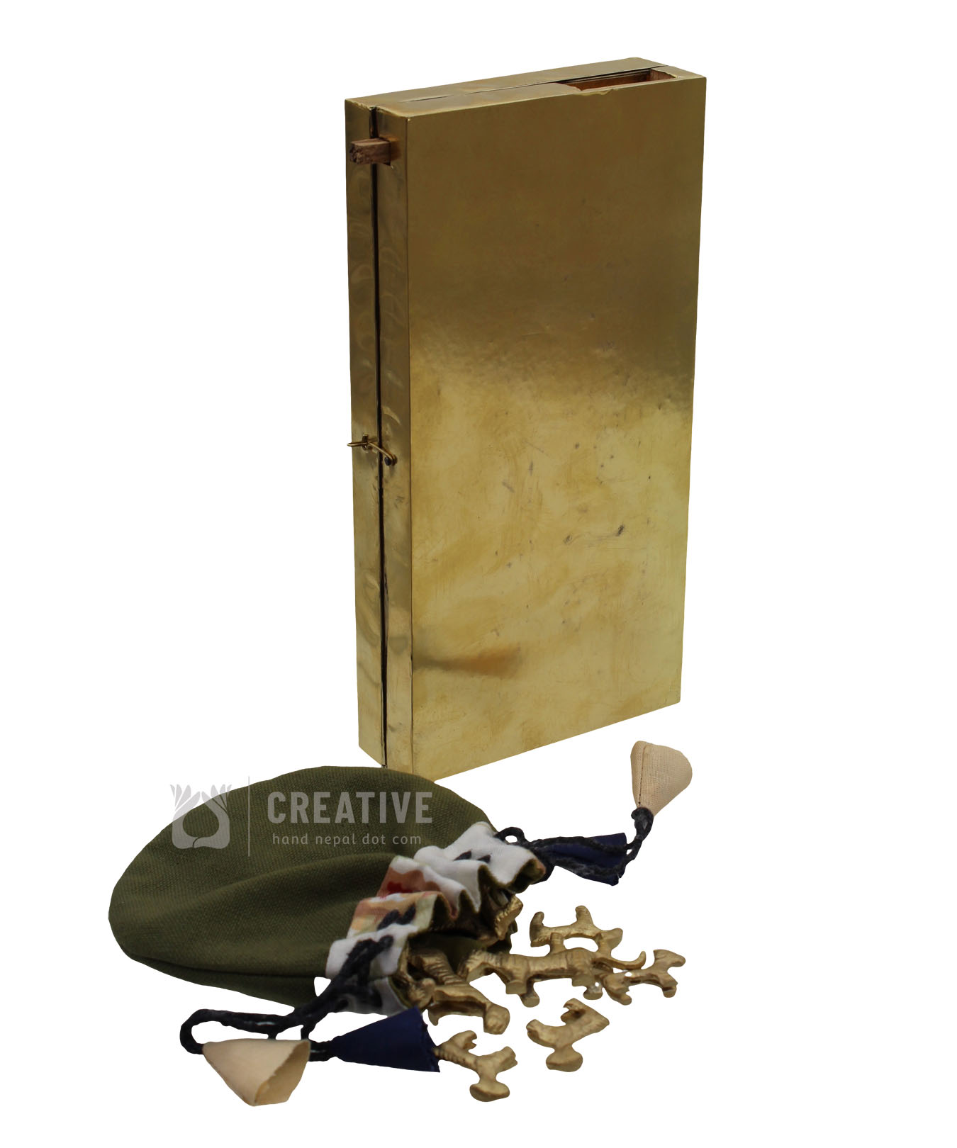 Nepalese board games Bagh chal ,It is made of brass-coated wood, the animals are made of brass.Included is folding game board with lock to hold closed and a compartment to hold the animal figurines.Bagh Chal or tiger tactics, is a strategy game originating in Nepal between two opponents.Bagh-Chal is a strategic, two-player board game that originates in Nepal. The game is asymmetric in that one player controls four tigers and the other player controls up to twenty goats. The tigers 'hunt' the goats while the goats attempt to block the tigers' movements.