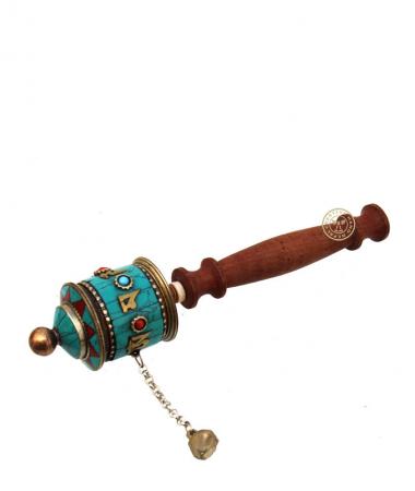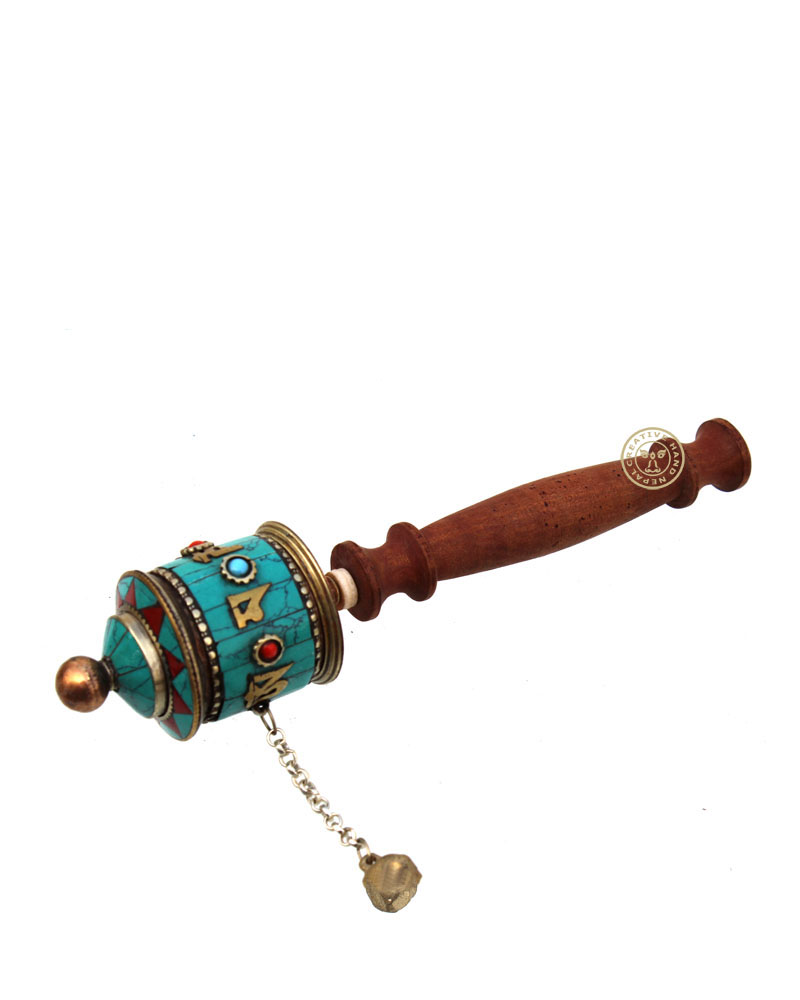 The prayer wheel is inlaid with turquoise . Tibetan prayer wheels (called Mani wheels by the Tibetans) are devices for spreading spiritual blessings and well being, for creating merit and removing bad karma. Rolls of thin paper, imprinted with many, many copies of the mantra (prayer) Om Mani Padme Hum, printed in an ancient Indian script or in Tibetan script, are wound around an axle in the protective container, and spun around and around.These Buddhist prayer wheels are made in the Kathmandu Valley by master Tibetan craftsmen. Approx 20 cm long 4 cm diameter