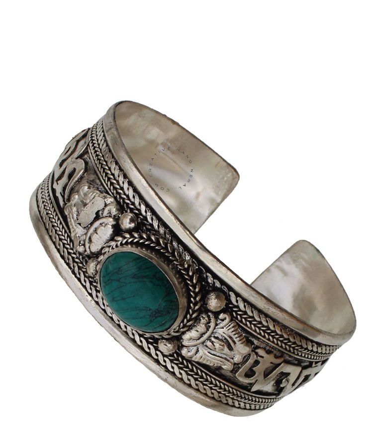 This Double Mantra Stone Bracelet is made from White Metal & Stone .They are attractive, adjustable and functional.This enchanting design is handcrafted in Nepal using traditional tools and techniques. Handmade organic defects in finish add to the artistic character of the piece. Please note that each bracelet is unique and stones cannot be specified. Approx 2 X 21 cm around.