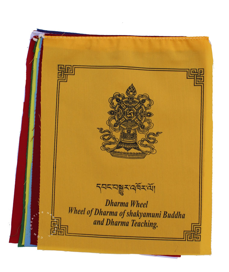 These flags may be placed either inside the house to increase the spiritual atmosphere or outside where the wind can carry the prayers. Approximately Each flag is 8 x 8 inch. String of 8 flags, approx. 65 inch long.
