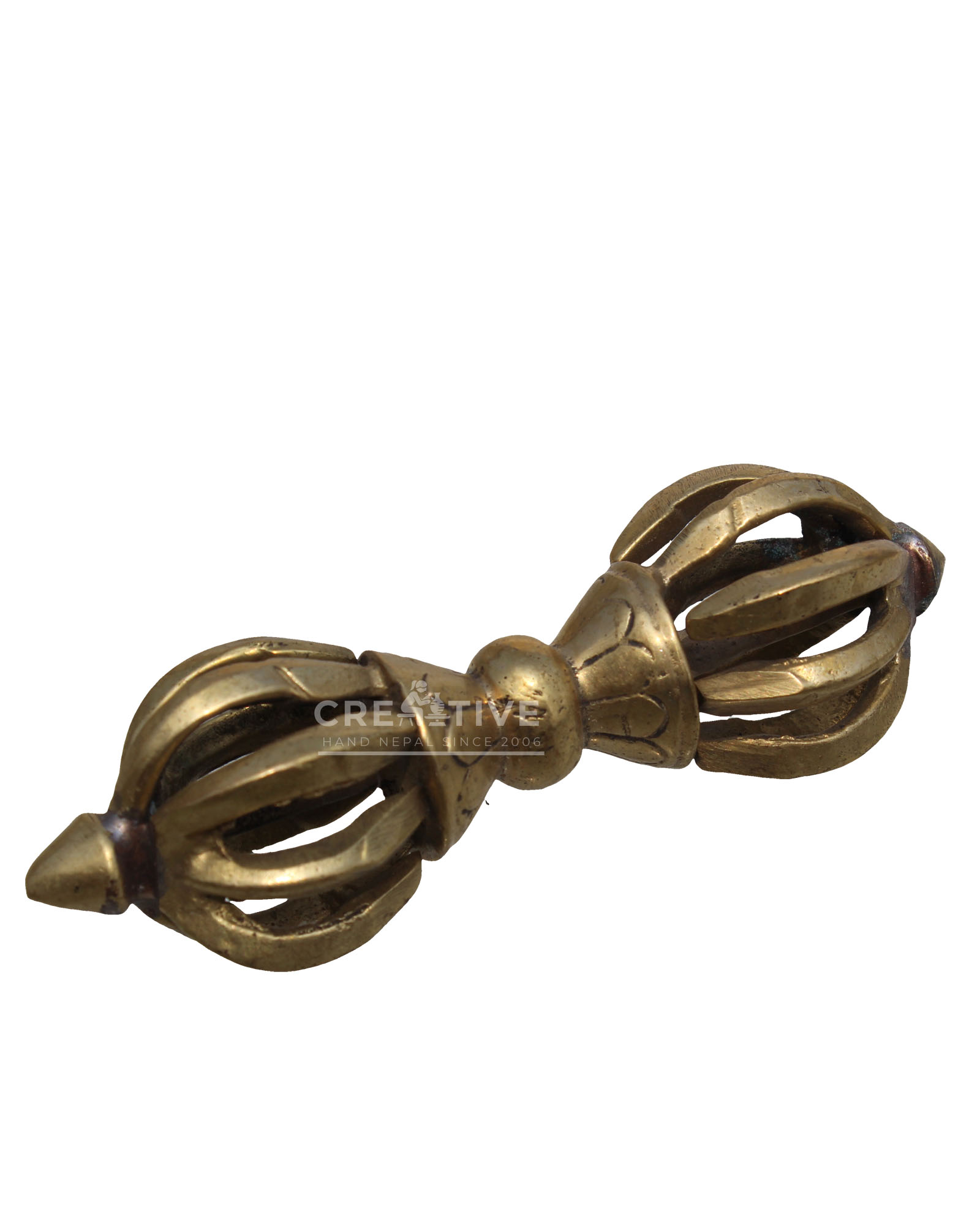 This Tibetan  Eight-Pronged Brass Dorje (Vishva-Vajra) symbolizes the indestructible force of enlightenment and the cosmic balance of spiritual energy. Handcrafted from brass by skilled artisans in Nepal, this double dorje features lotus-inspired detailing, measuring approx. 3 cm x 9 cm and weighing 90  grams. A powerful piece for rituals, altar use, or spiritual decor.