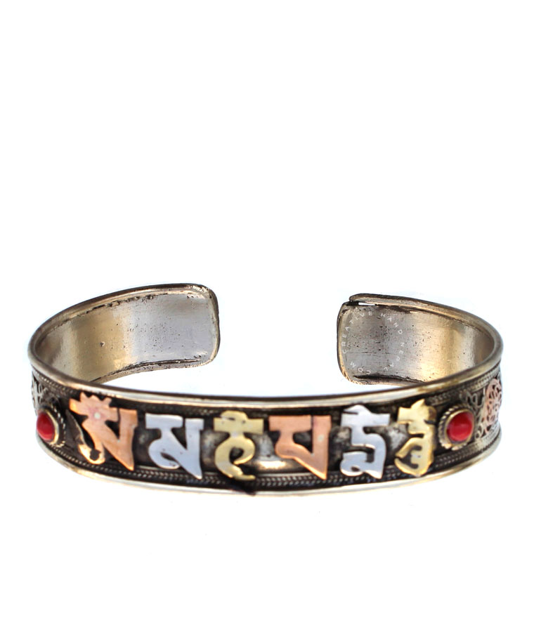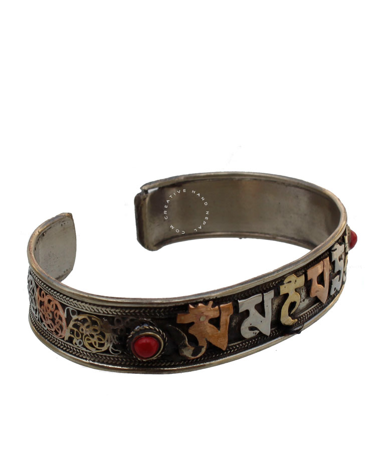 Tibetan  Mantra "Om Mani Padme Hum" at the center of the bracelet, with small Turquoise or red Coral beads and at the outside  Delicate filigree design  with all the details of a Mantra art work Small weaving designs at the top and bottom .This Bracelet is handcrafted in Nepal using traditional tools and techniques. Handmade organic defects in finish add to the artistic character of the piece .Please note that each bracelet is unique and stones cannot be specified. Approx 1 cm Height & 18 cm around.