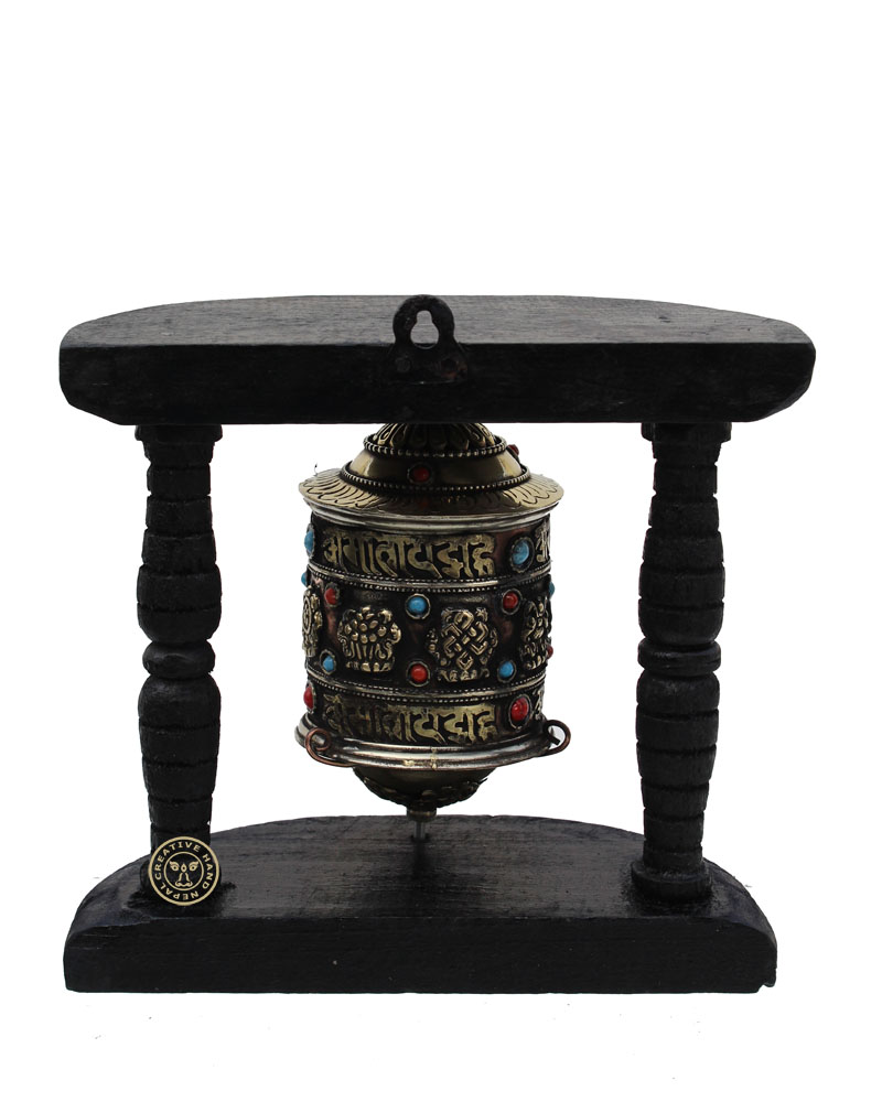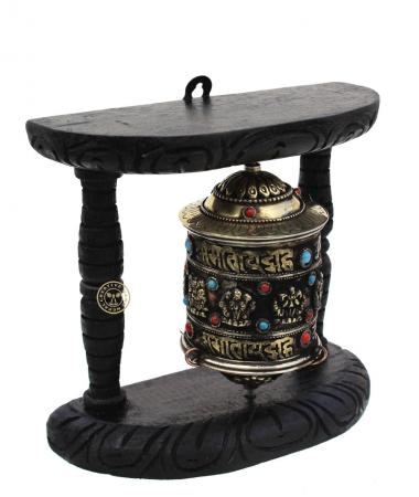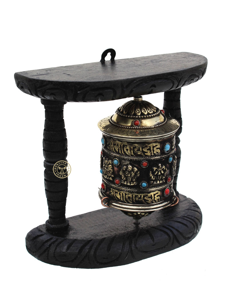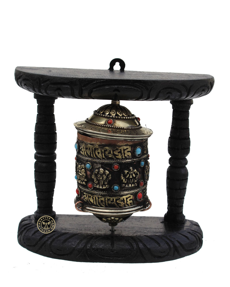 This prayer wheel is similar Design as most of prayer wheels around Stupa in Nepal. This Prayer Wheel is made of Copper , Brass & Wood. Sacred Buddhist mantras are written on a long roll of paper kept inside this wheel. This roll of mantras rotates with each rotation of this wheel. With every rotation of wheel, these mantras are believed to be recited once.These prayer wheels are mainly for decorative purposes in your lounge room, meeting room and meditation room. It is 6.5 inch" tall, 7 inches Length and 3 inch wide on the top of the prayer wheel. This product was individually crafted and finished. This process ensures that no two pieces are exactly alike. Variations in size, shape and finish make each piece a unique work of art.