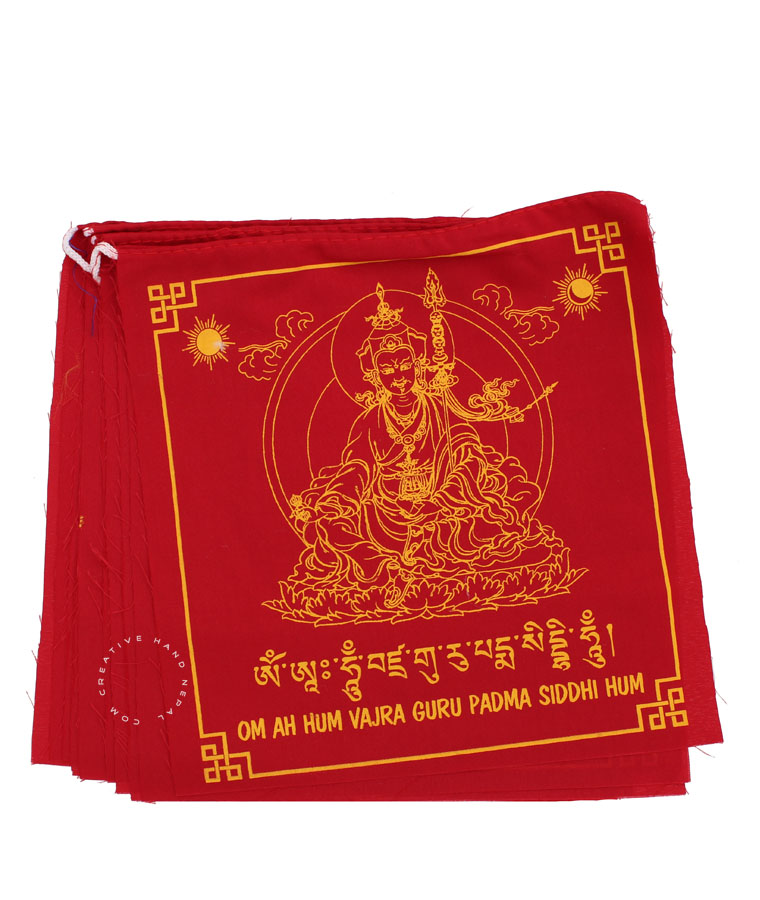 This listing is for a roll of prayer flags and there are 10 flags in the roll and each flag measures 9 inches by 9 inches. Each of the flag has Guru Rinpoche and Guru Rinpoche Mantra.