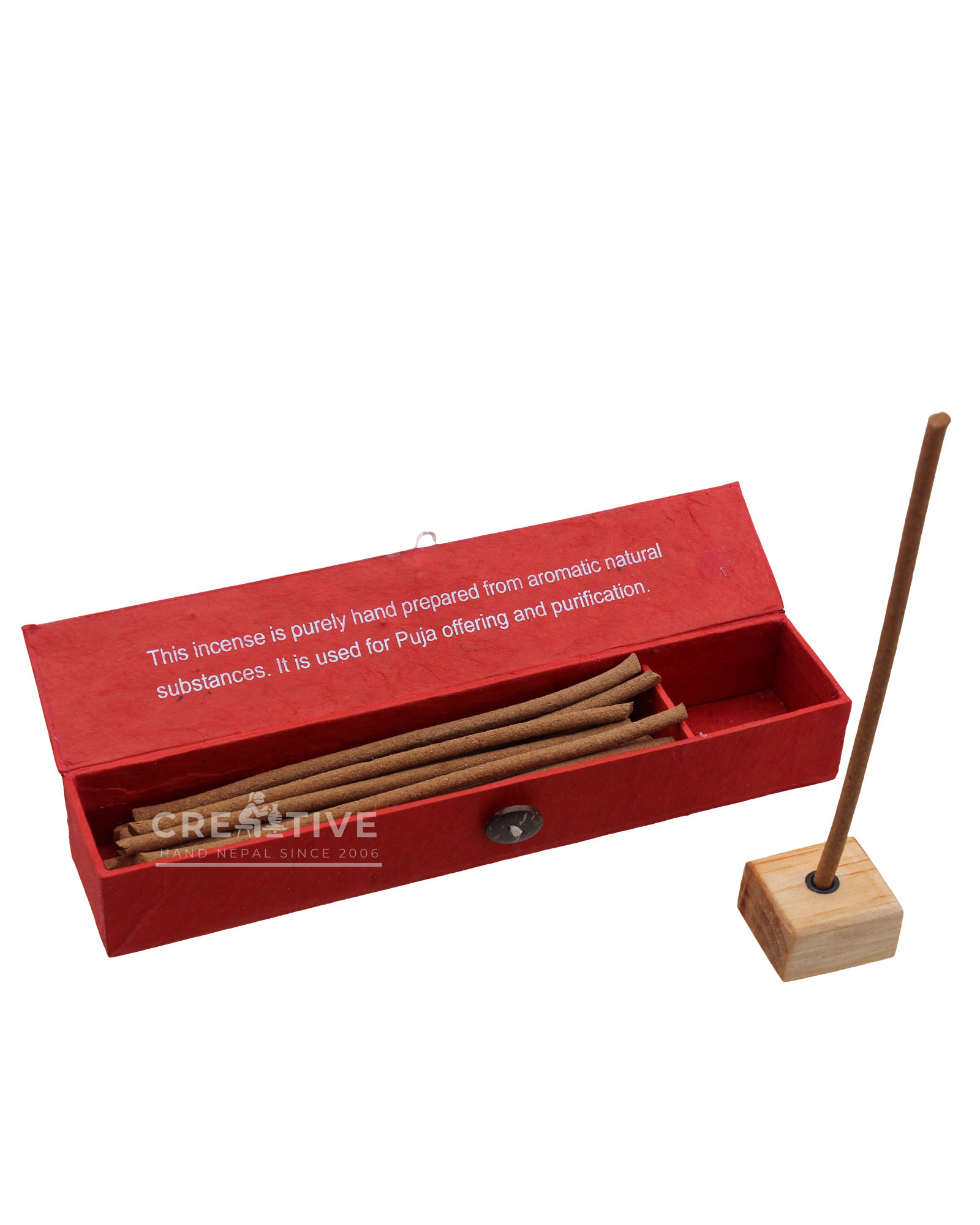 This incense is purely handcrafted from aromatic natural ingredients, perfect for puja offerings and spiritual purification. Includes an elegant wooden incense burner.
