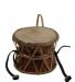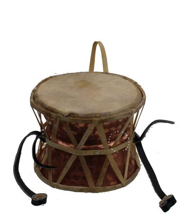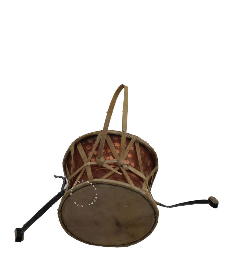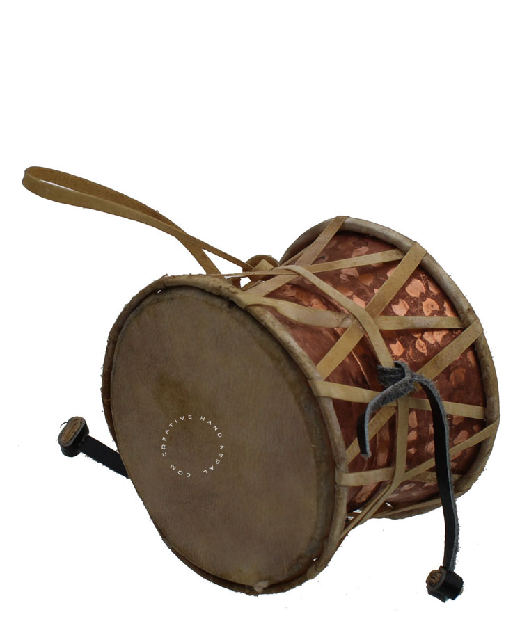 This traditional Damaru is hand made in Nepal. This Damaru Drum has two beads which create a pleasing sound when rocked from side to side.  Slight variation may occur in color, size and design enhancing individual artistic character of each piece. Approximately 4" inch diameter and light, with good tone.