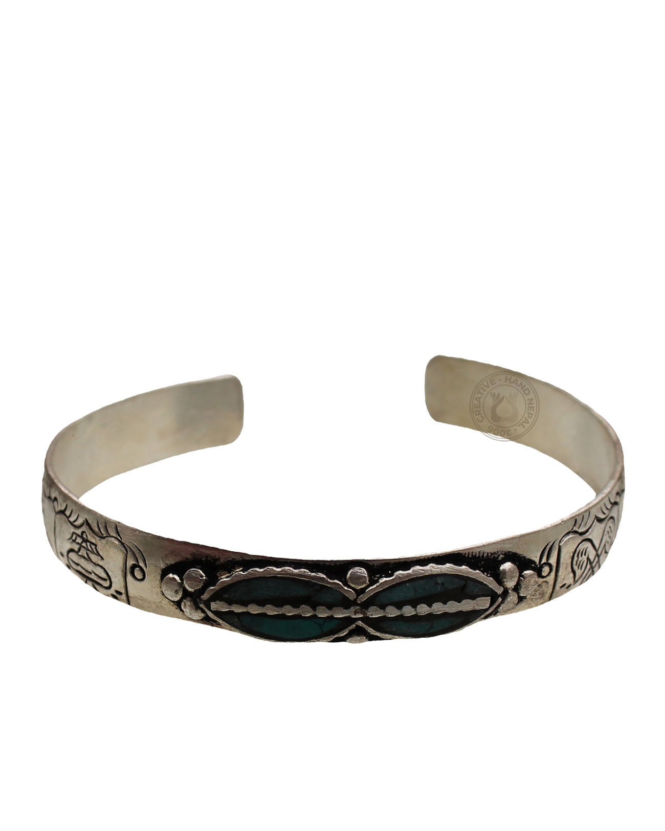 A beautiful hand crafted Tibetan dharma symbol work on white metal plated silver color Bracelet .this  item is hand-made, the actual product may vary slightly from the picture. Approximately 1 cm wide x 20 cm long. Adjustable Size