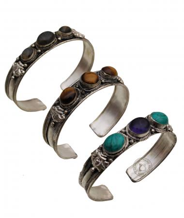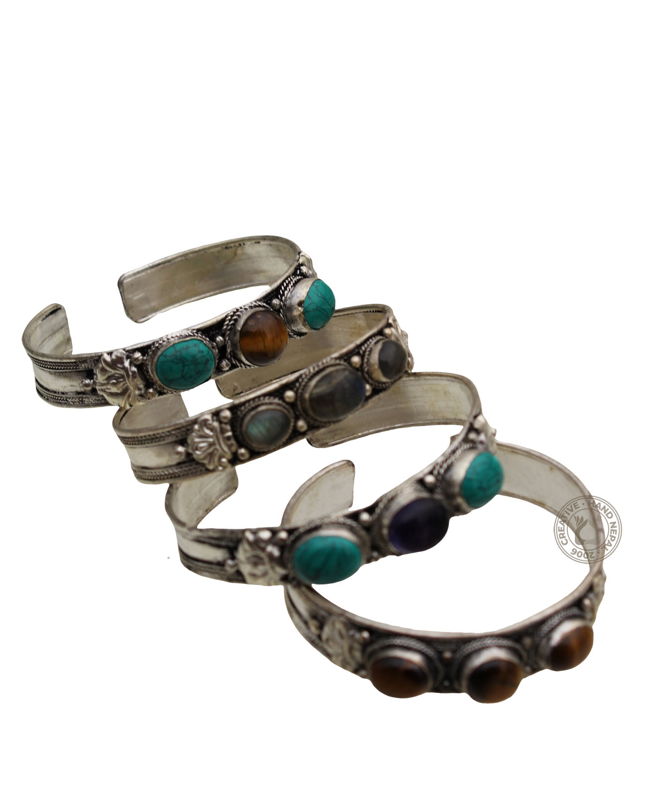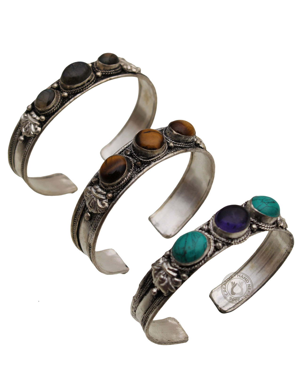 The Three Stone Plain Bracelet is a beautifully handcrafted piece of jewelry that is made using traditional tools and techniques in Nepal. This bracelet features a simple, yet elegant design that showcases a single stone as the centerpiece.