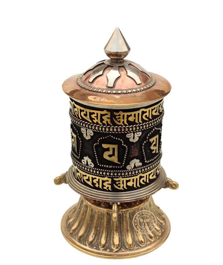 This Mantra Tibetan Table Prayer Wheel is made of Copper & Brass. Sacred Buddhist Newari mantras are written on a long roll of paper kept inside this wheel. This roll of mantras rotates with each rotation of this wheel. With every rotation of wheel, these mantras are believed to be recited once. It is 15 CM4" tall, 8 CM wide on the top of the prayer wheel. This product was individually crafted and finished. This process ensures that no two pieces are exactly alike. Variations in size, shape and finish make each piece a unique work of art.