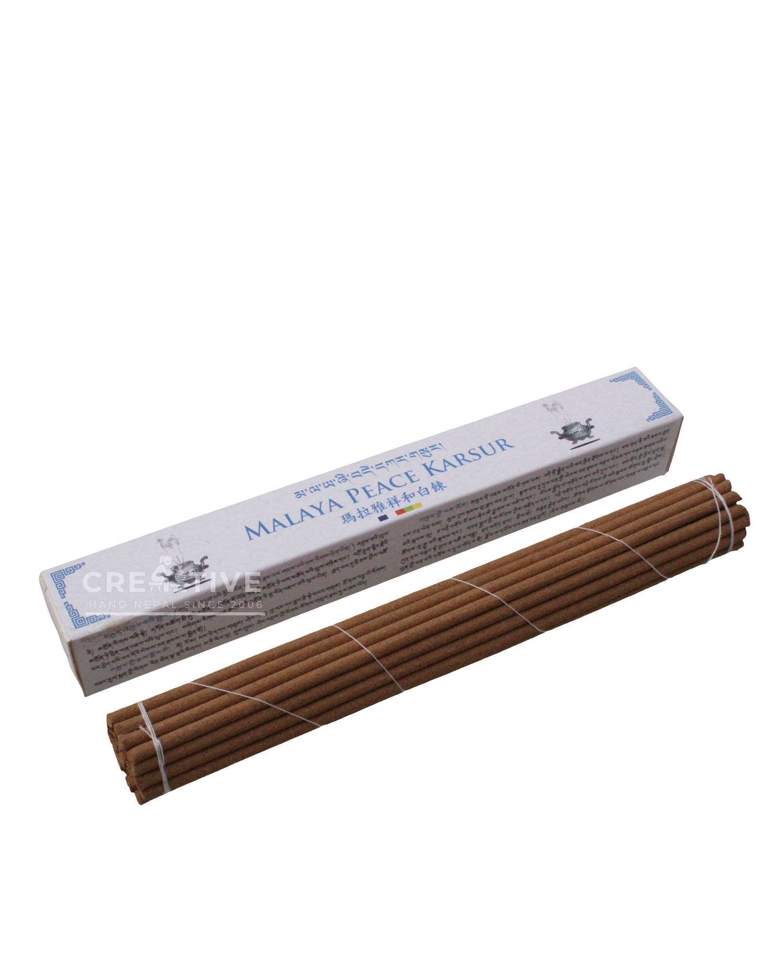 Malaya Peace Karsur Tibetan Incense is handcrafted using a sacred blend of herbs, soil, and water sourced from the Himalayan ridge regions of Nepal, India, Bhutan, and Sri Lanka. This incense is traditionally blessed in the names of the Buddha, Guru Rinpoche, and numerous Bodhisattvas, honoring centuries of spiritual lineage.
