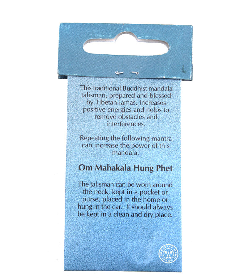 These hand woven pendants are made entirely by hand. Each one is woven to a prescribed mandala design for protection. This traditional Buddhist mandala talisman, prepared and blessed by Tibetan lamas, increases positive energies and helps to remove obstacles and interferences .Repeating the following mantra can increase the power of this mandala:"OM MAHA KALA HUNG PHET".This talisman can be worn around the neck, kept in the pocket or purse, placed in the home or hung in the car. It should always be kept in a clean and dry place. Please Note: These pendants are delivered in an assortment of colours. Approx Dimensions : 2,5 x 2,5 cm