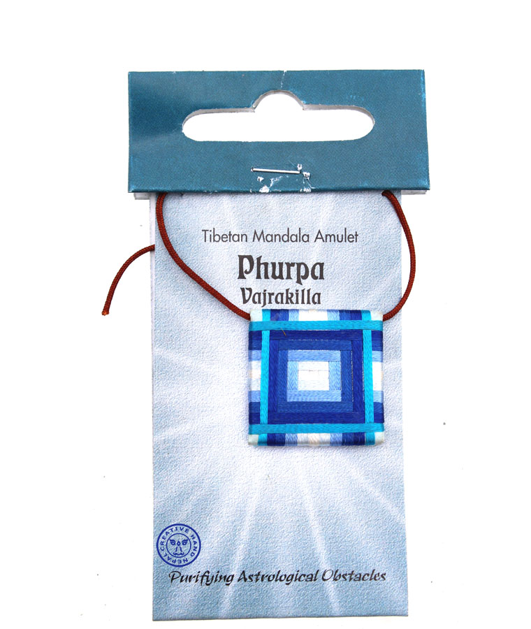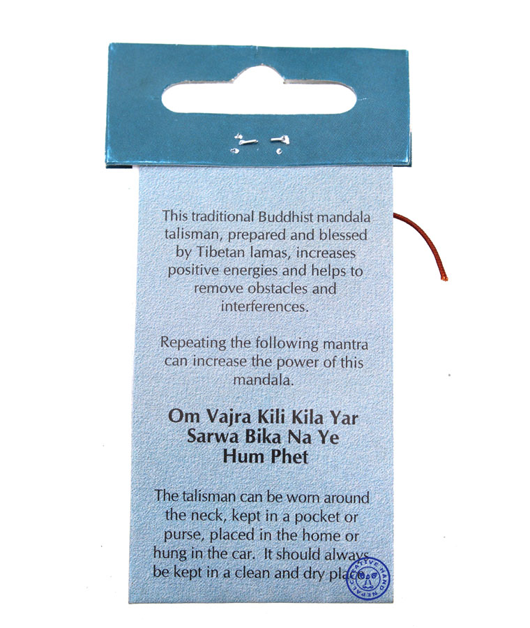 These hand woven pendants are made entirely by hand. Each one is woven to a prescribed mandala design for protection. This traditional Buddhist mandala talisman, prepared and blessed by Tibetan lamas, increases positive energies and helps to remove obstacles and interferences .Repeating the following mantra can increase the power of this mandala:"OM VAJRA KILI KILA YAR SARWA BIKA NA YE HUM PHET".This talisman can be worn around the neck, kept in the pocket or purse, placed in the home or hung in the car. It should always be kept in a clean and dry place. Please Note: These pendants are delivered in an assortment of colours. Approx Dimensions : 2,5 x 2,5 cm