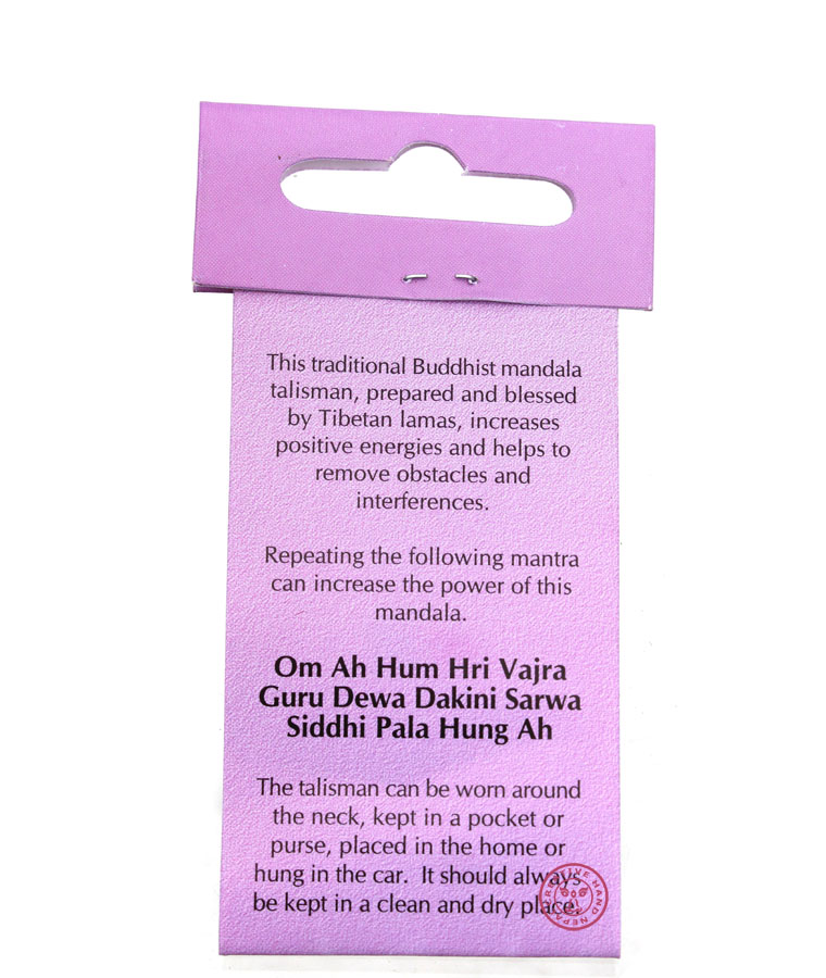 These hand woven pendants are made entirely by hand. Each one is woven to a prescribed mandala design for protection. This traditional Buddhist mandala talisman, prepared and blessed by Tibetan lamas, increases positive energies and helps to remove obstacles and interferences . Repeating the following mantra can increase the power of this mandala:"OM AH HUM HRI VAJRA GURU DEWA DAKINI SARWA SIDDHI PALA HUNG AH".This talisman can be worn around the neck, kept in the pocket or purse, placed in the home or hung in the car. It should always be kept in a clean and dry place. Please Note: These pendants are delivered in an assortment of colours. Approx Dimensions : 2,5 x 2,5 cm