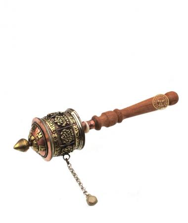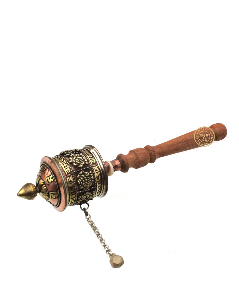 This is a beautiful Tibetan Buddhist Hand Held Prayer Wheel The Tibetan Buddhist Symbol Ashtamangala, is carved on the outside of this prayer wheel, Sacred Buddhist mantras are written on a long roll of paper kept inside this wheel. This roll of mantras rotates with each rotation of this wheel. With every rotation of wheel, these mantras are believed to be recited once.There are slight variations to design on each. It measures 9 Inch in Long and has a 2.5 diameter .