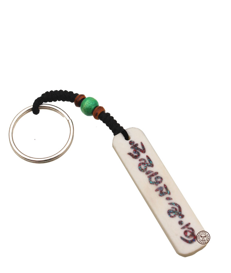 Tibetan Mantra stone inlay Carved Bone keyring each design is unique and will vary slightly from photos use as keyring, keychain, zip puller, bag charm and lots more.... key ring measures approximately 5 inch long .