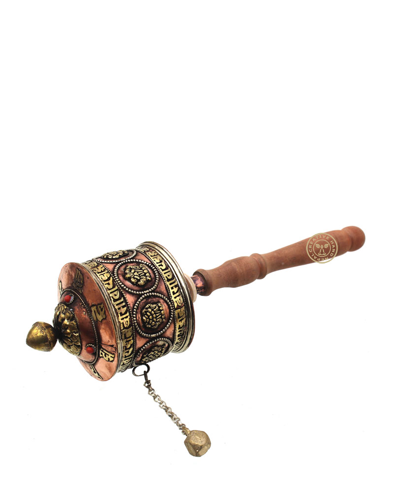 This is a beautiful Tibetan Buddhist Hand Held Prayer Wheel The Tibetan Buddhist Symbol is carved on the outside of this prayer wheel, Sacred Buddhist mantras are written on a long roll of paper kept inside this wheel. This roll of mantras rotates with each rotation of this wheel. With every rotation of wheel, these mantras are believed to be recited once.There are slight variations to design on each. Dimensions: 13 inch Height x 3.5 inch Width x 4 inch Depth