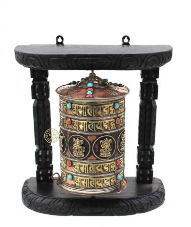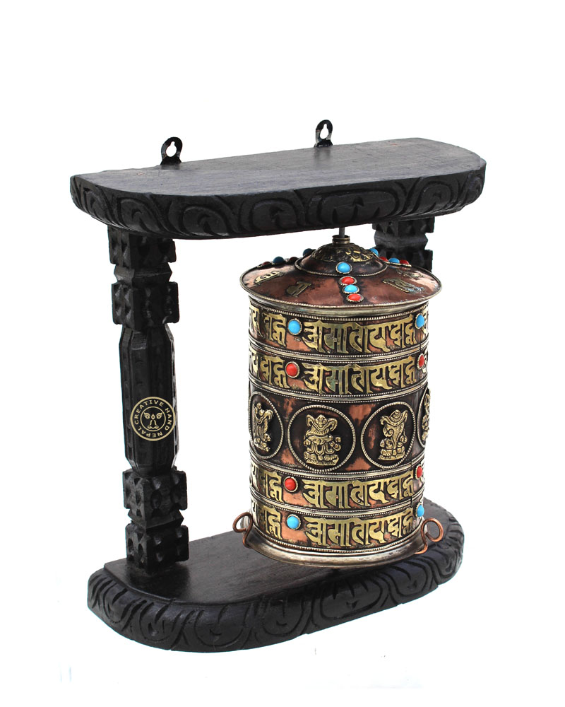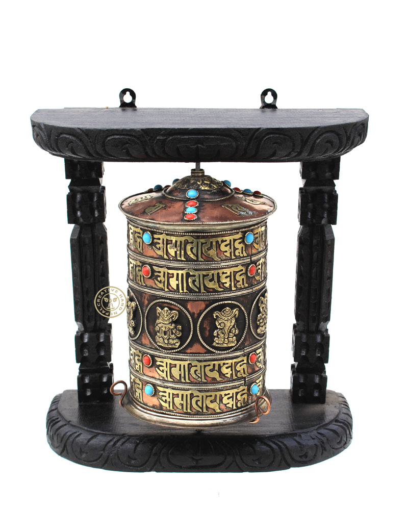 This Tibetan wall hanging prayer wheel is made of copper body, wood frame.The Tibetan Buddhist mantra, “Om mani padme hum,” is written around the outside of the prayer wheel.
