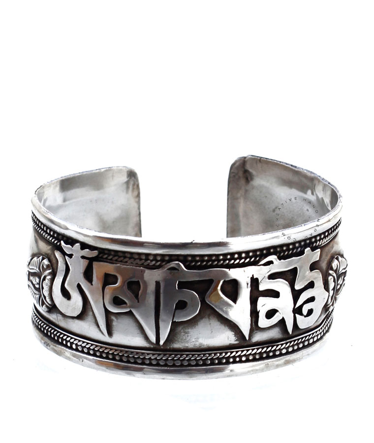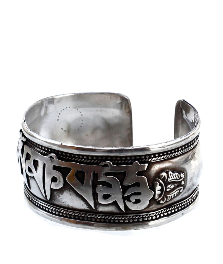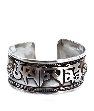 This magnificent adjustable cuff bracelet is made White Metal. Raised letters in elegant detail depict the Sacred Om Mane Padme Hum Mantra , the most sacred of Tibetan Buddhist Chants. Approx 3.5 cm wide