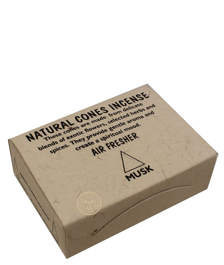 These air fresher Musk cones are made from delicate blends of exotic flowers and are composed of aromatic biotic materials.They release gentle aroma or fragrant smoke when burned and create a spiritual atmosphere around your surroundings. This pack contains 25 cones and a stand is also provided with it. The burning time for a cone is 20 minutes. Approx 2.5 x 3 inch Box