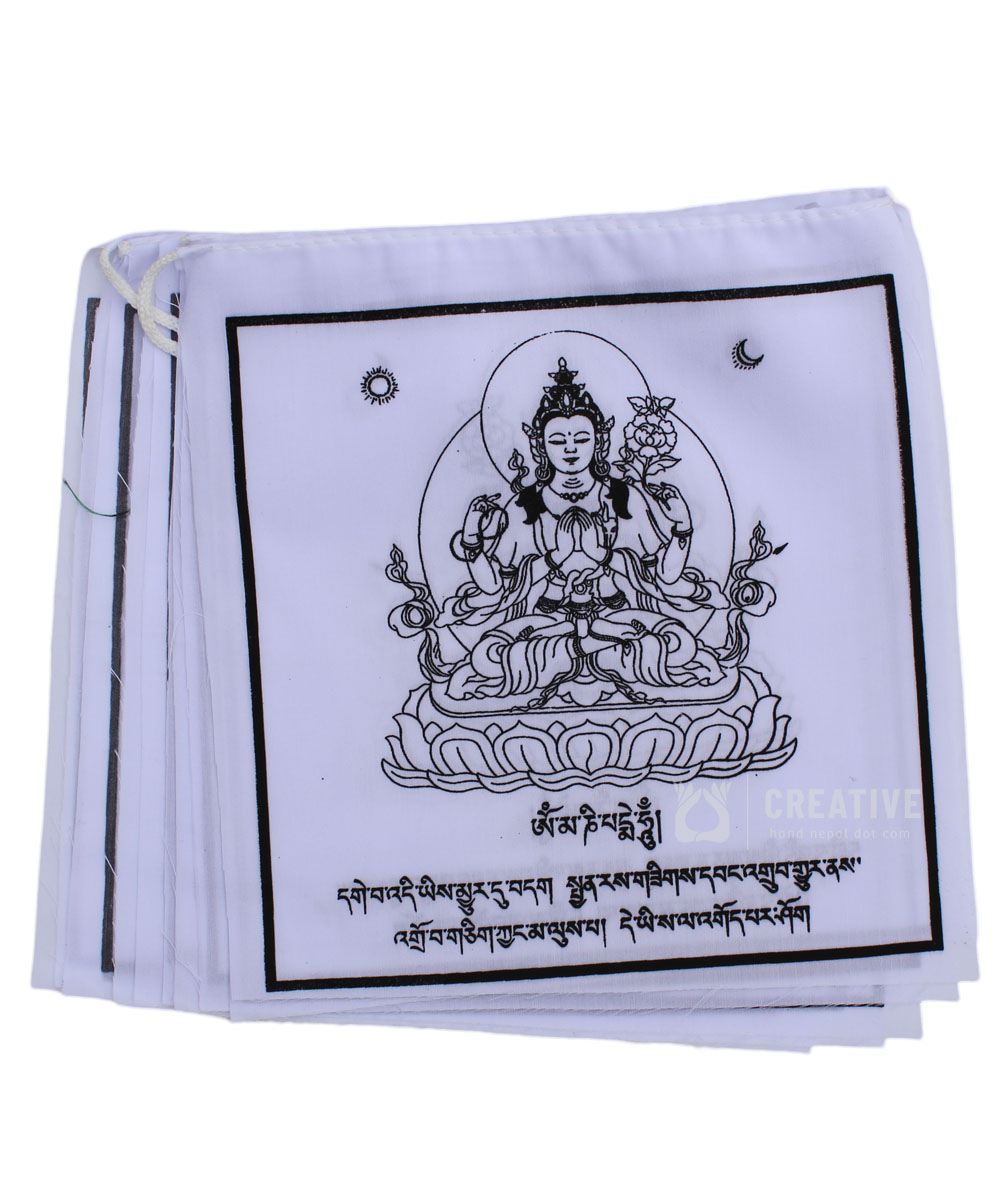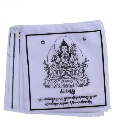 Experience the tranquil and compassionate energy of Chenrezig Solid White Color Tibetan Prayer Flags. These prayer flags feature the image of Chenrezig, the embodiment of compassion, and are adorned in a solid white color, symbolizing purity and peace. Hang these serene prayer flags in your space to cultivate an atmosphere of compassion and tranquility. As the flags flutter in the wind, they carry the blessings and spiritual energy of Chenrezig, spreading his compassionate vibrations and invoking peace. Embrace the transformative power of Chenrezig and invite his compassionate presence into your life with the Chenrezig  Tibetan Prayer Flags. Chenrezig is known under many different names: Avalokiteshvara in sanskrit, Kuan Yin in Chinese and Kannon in Japanese. He is always painted in white to represent how  free he is of all the veils of Samsara. His four arms symbolize the 4 virtues; love, compassion, joy and equanimity. This indicates his vow to Buddhas and Bodhisattvas to protect all sentient beings from suffering. The hands hold a wish-fulfilling jewel, which symbolizes his compassionate Bodhichitta.