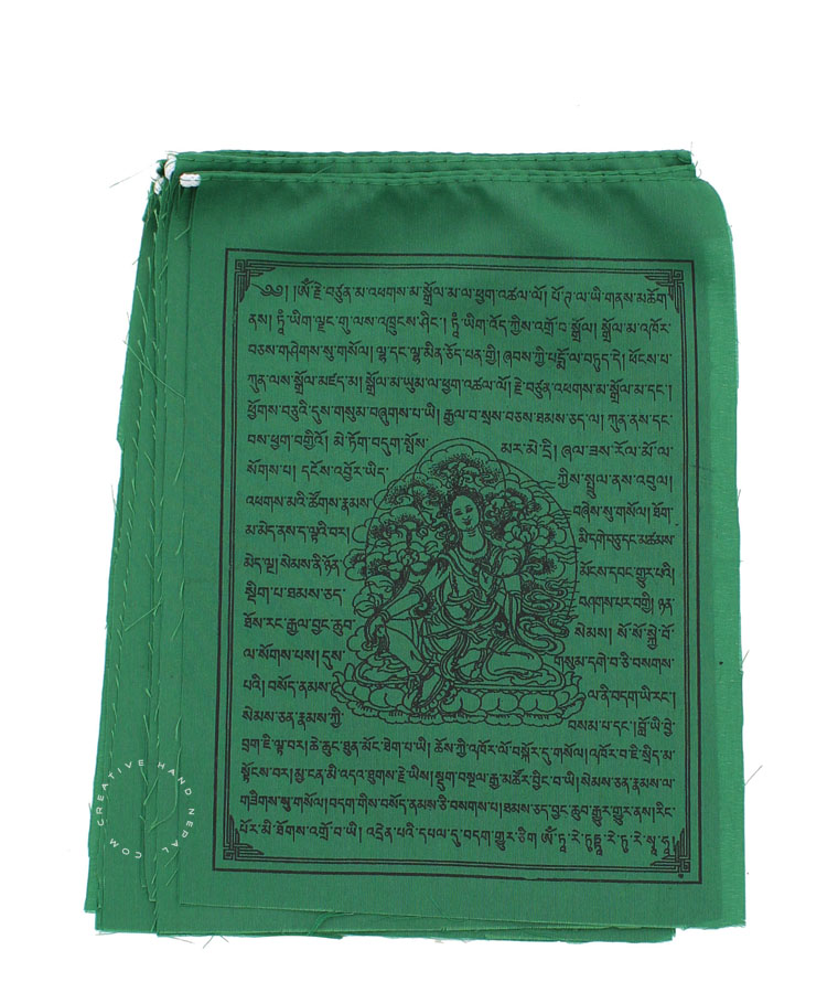 Green Tara, Bodhisattva of Salvation: fast and active on releasing fears, solving problems, helps to obtain ambitions and goals and protects against threats. . Approx 6 x 8 inch (10 flags )