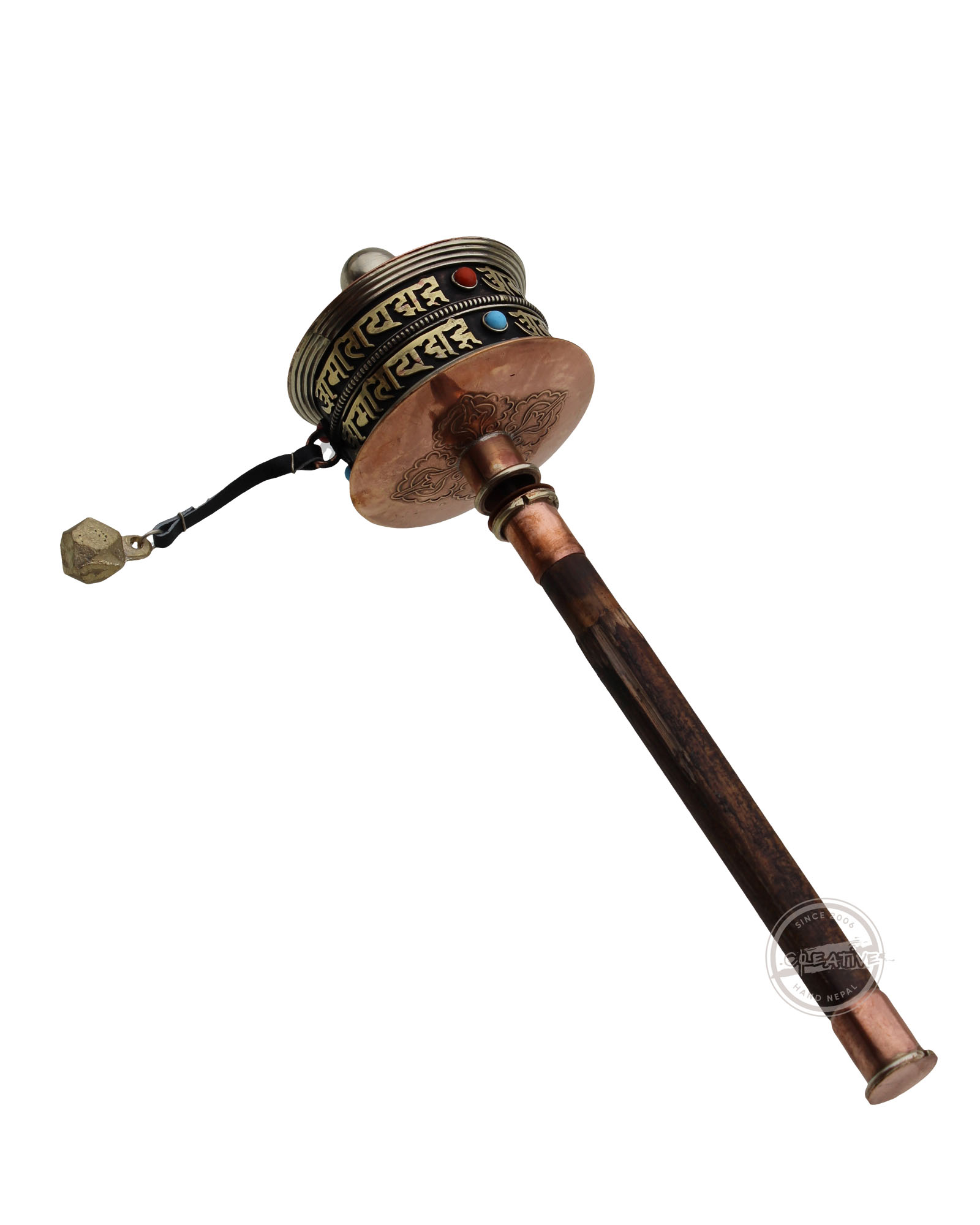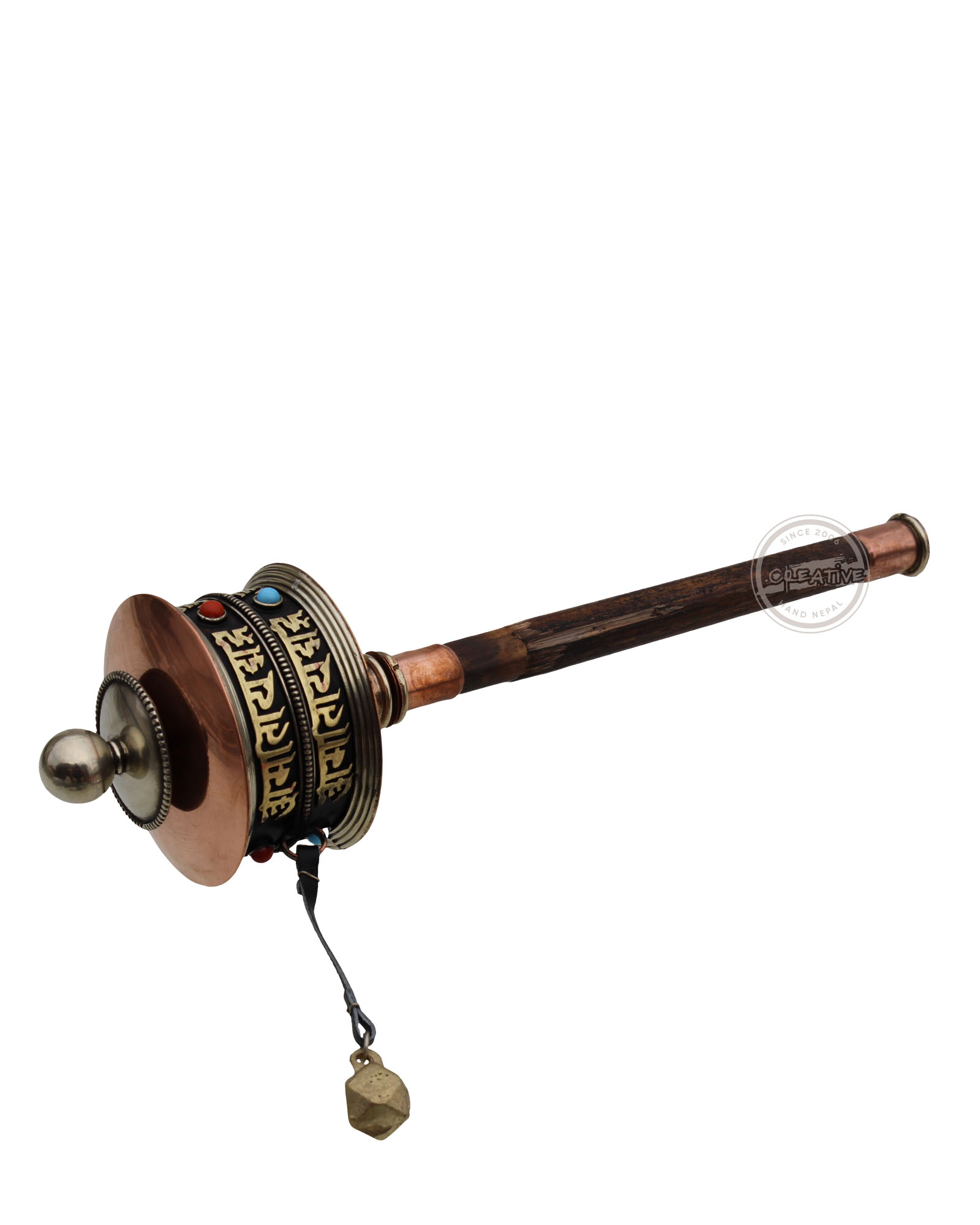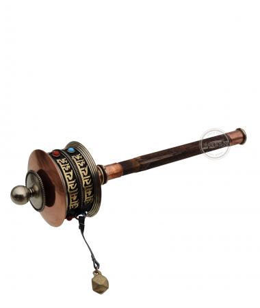 The artistry of spirituality with our hand-held prayer wheel. Crafted from copper, engraved with a two-line Newari script mantra 'Om Mani Padme Hum,' and adorned with stone beads. The wooden handle ensures a mindful meditation experience. Inside are scrolls containing mantras and prayers which multiply with each turn.