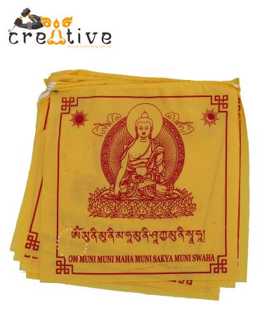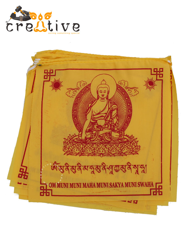 This listing is for a roll of prayer flags and there are 10 flags in the roll and each flag measures 9 inches by 9 inches. Each of the flag has Shakyamuni Buddha and Shakyamuni Buddha Mantra.