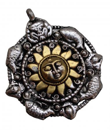 A sun pendant amulet is a piece of jewelry that features the image of the sun. The sun has been revered by many cultures throughout history as a symbol of warmth, light, life, and renewal. In many mythologies and religions, the sun is associated with divine power and is often worshipped as a deity.a sun pendant amulet can be a powerful and meaningful piece of jewelry that represents the sun's many positive qualities and the divine power that it represents. Approx 4 x 5 cm