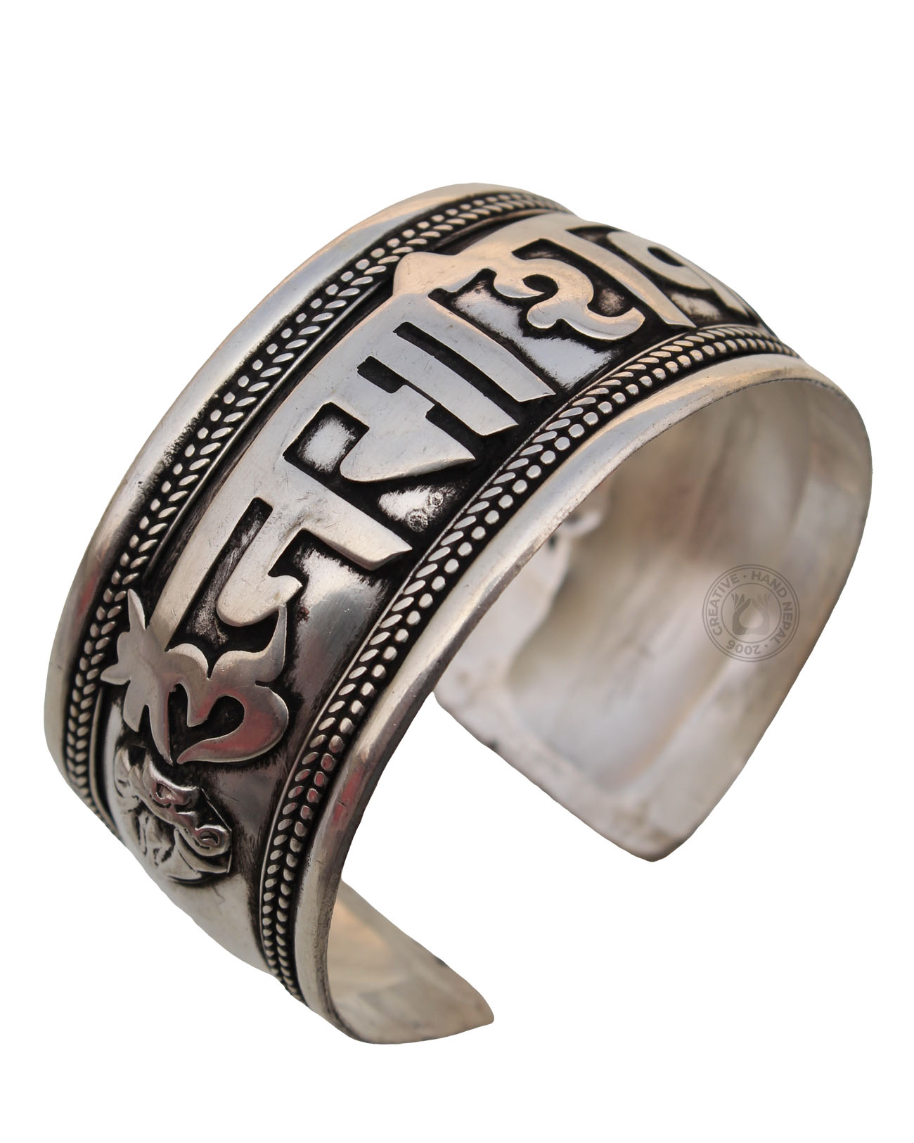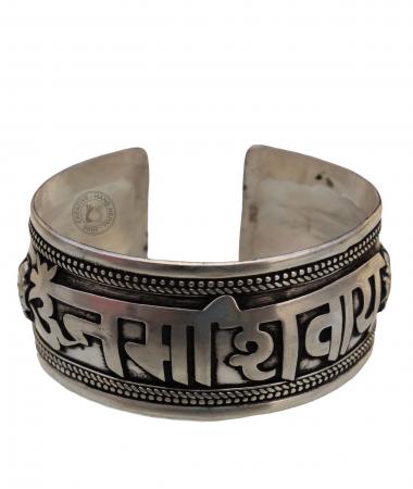 This magnificent adjustable cuff bracelet is made White Metal. Raised letters in elegant detail depict the Sacred , the most sacred of Hindu Chants. The "Om Namah Shivaya" mantra is indeed one of the most sacred and revered mantras in Hinduism, and is believed to have profound spiritual and transformative power. Wearing a bracelet with this mantra may serve as a constant reminder to cultivate inner peace, mindfulness, and connection to the divine. Approx 3 X 19 cm wide
