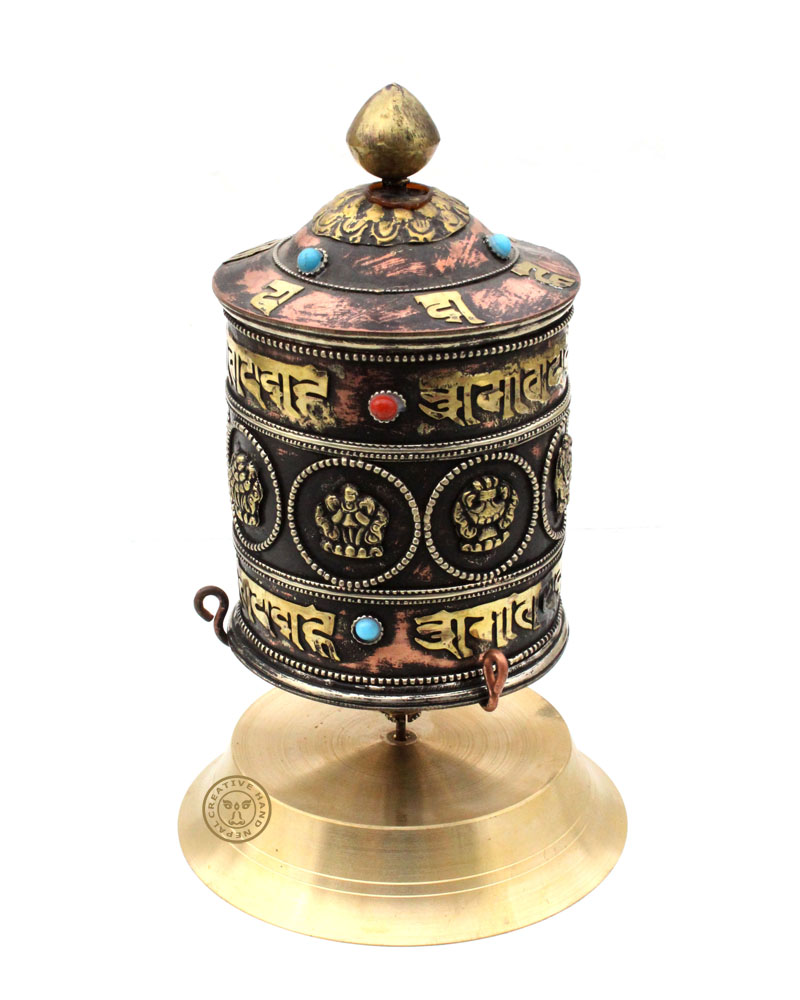 This table-top metal prayer wheel is decorated on the outside with the eight auspicious symbols, while the inside is filled with thousands of repetitions of the mantra Om Mani Padme Hum written in an ancient Newari script. Prayer wheels can be placed on the corner of a desk, or on an altar. Spinning the prayer wheel clockwise creates merit and benefit as the mantras are released. Prayer wheels are holy objects that enhance your meditation practice, allowing you to accumulate merit and purify obscurations. As a holy object, a prayer wheel brings benefit to your Dharma practice and to all beings. It is 8 inch" tall, 3.8 inches wide and 5 inch Baceon the top of the prayer wheel.