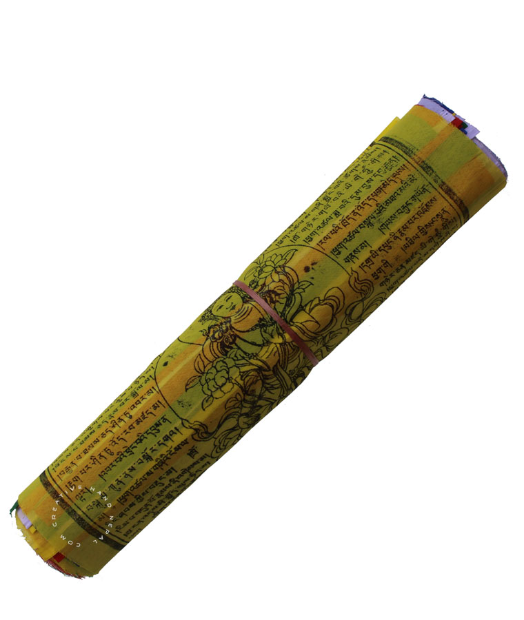 These Green Tara prayer flags are printed with the ancient Tibetan mantra to Tara, relieving us of physical, emotional, and spiritual suffering. Each prayer strand consisted of 25 flags with each flag approximately 33 cm across by 40 cm.