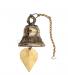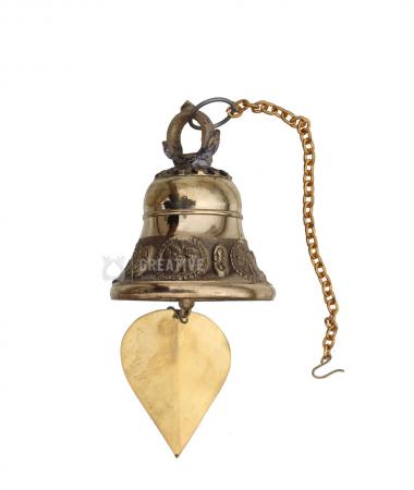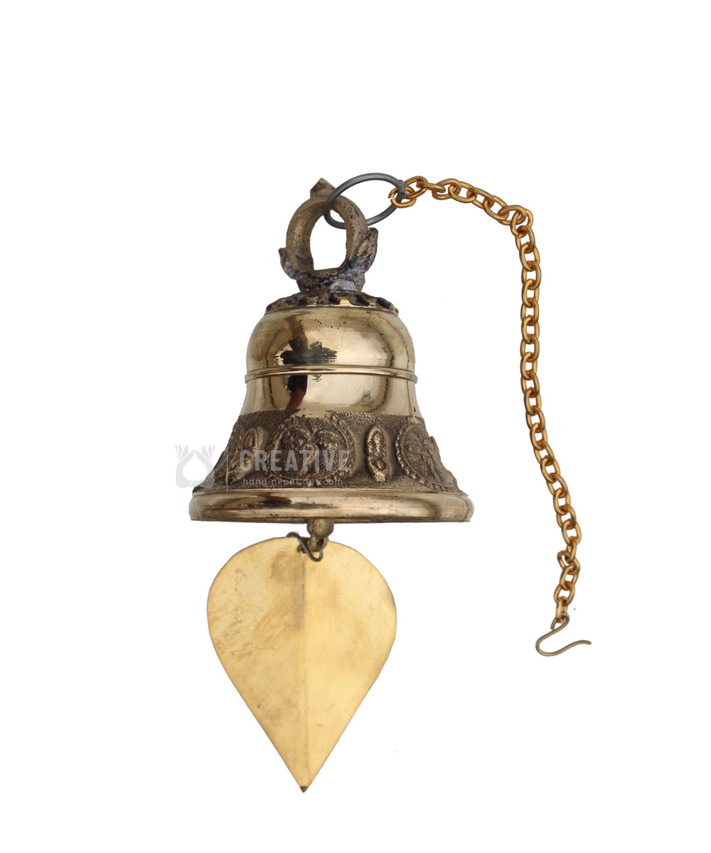 This hanging bell is made of brass in traditional Temple bell design. The sound is light and airy.  It is hanged outdoor window ,door, garden and also hanging indoors as a decorative item. Total Lenght Bell together with brass leaf and chain measures 11.5 inch  in height, Bell is 3.3 inch Tall and 2.7 inch wide (diameter).