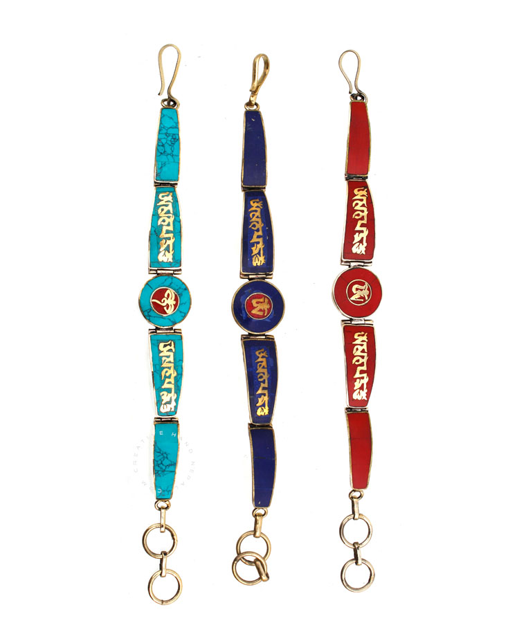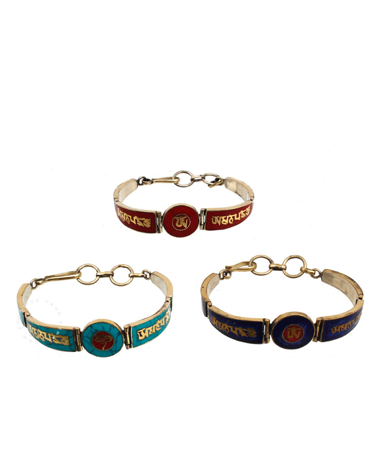 This bracelet is made from Metal with  Lapis and Other Stone Chips .This bracelet has Tibetan mantra on the front of the bracelet.There are Om Mani Padme Hum designs around the sides of this bracelet. This bracelet is .Approx 1.5 cm X 30 Cm Long and it is adjustable.