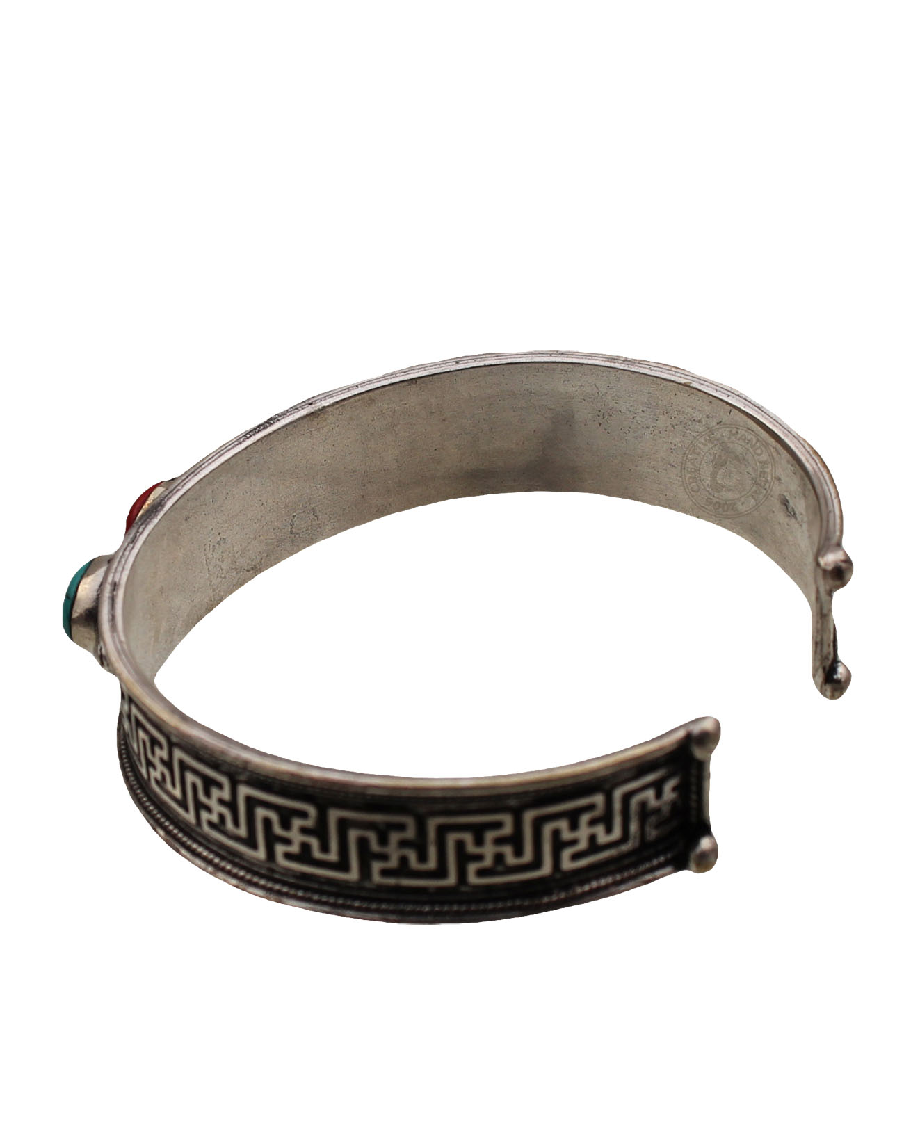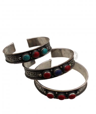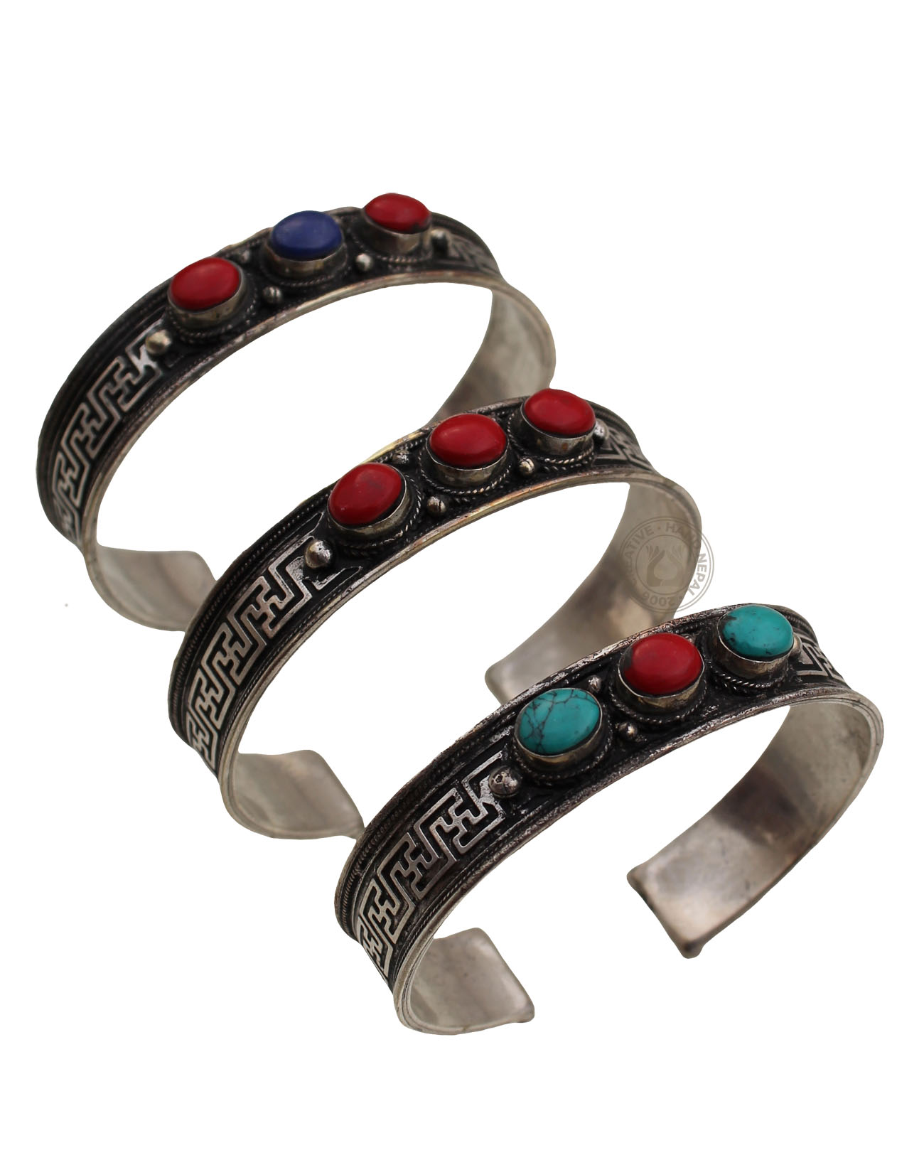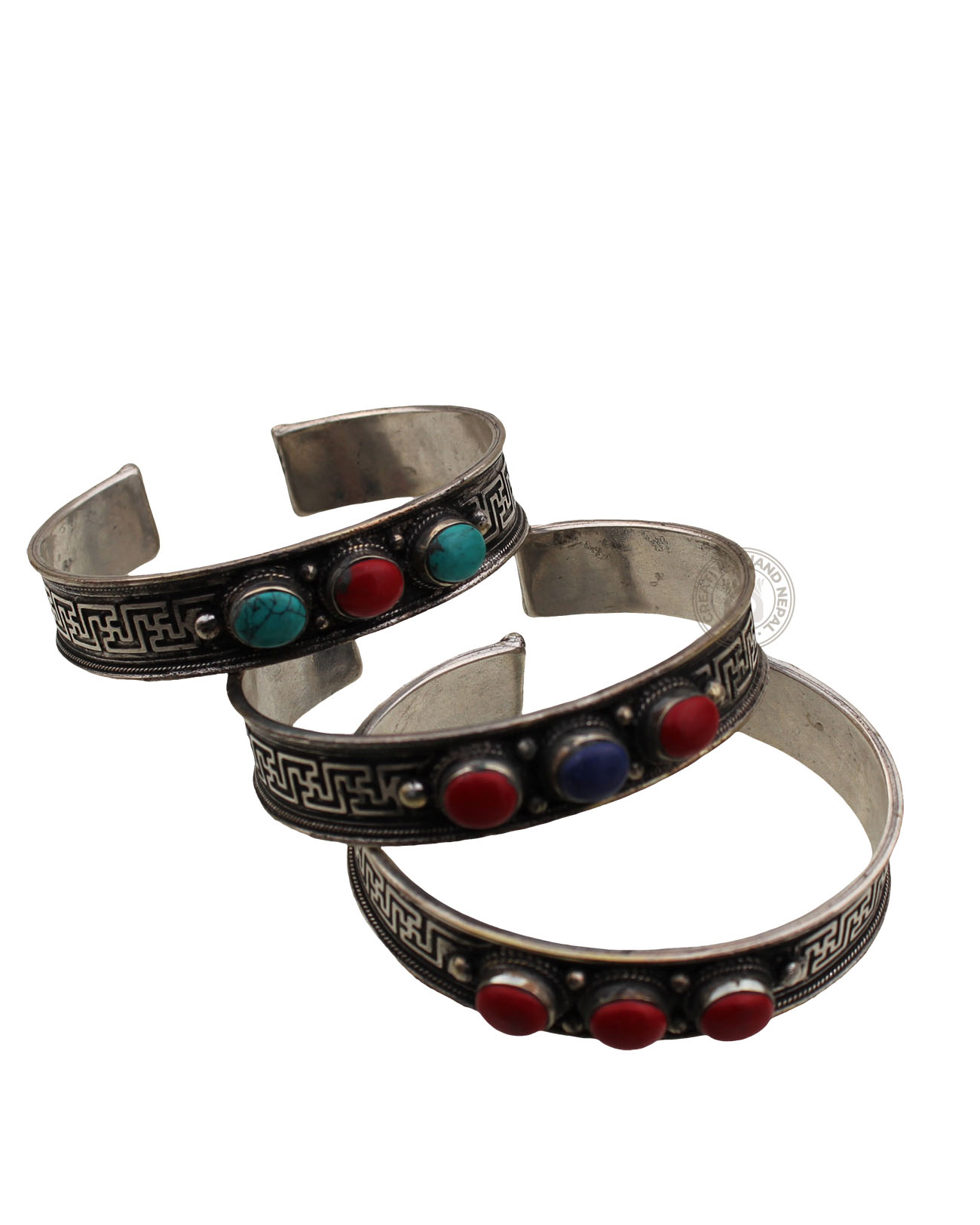 This bracelet is made from white Metal and  Beads .There are three Beads  in the center of the bracelet and beautiful Traditional Tibetan Motif design all the way to both ends. Mix Stone Only Approximately 1 cm wide x 18 cm long. This Bracelet can be adjustable to fit any wrist.