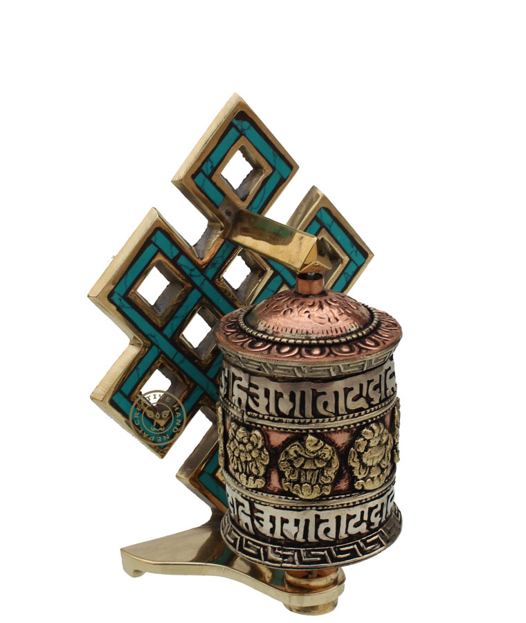 This Endless knot Tibetan Prayer Wheel is beautifully designed with Copper and Brass. prayer wheel is decorated on the outside with the Lucky symbol & OM MANI PADME HUM  Buddhist Mantra, while the inside is filled with thousands of repetitions of the mantra Om Mani Padme Hum written in an ancient  script. Prayer wheels can be placed on the corner of a desk, or on an altar. Spinning the prayer wheel clockwise creates merit and benefit as the mantras are released. Prayer wheels are holy objects that enhance your meditation practice, allowing you to accumulate merit and purify obscurations. As a holy object, a prayer wheel brings benefit to your Dharma practice and to all beings. It is 12 cm tall, 7 cm wide on the top of the prayer wheel.