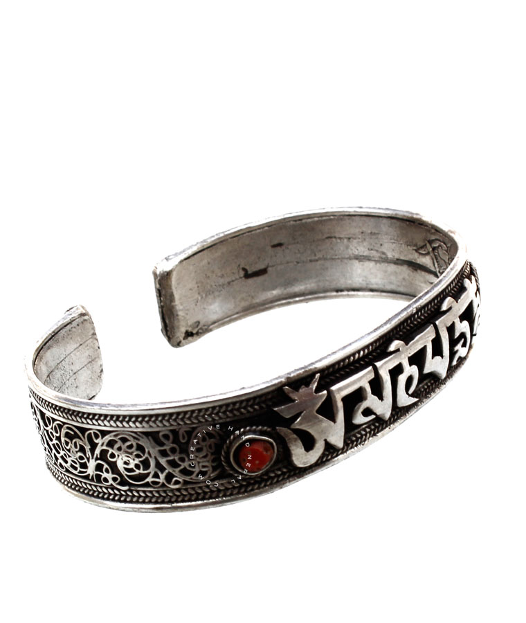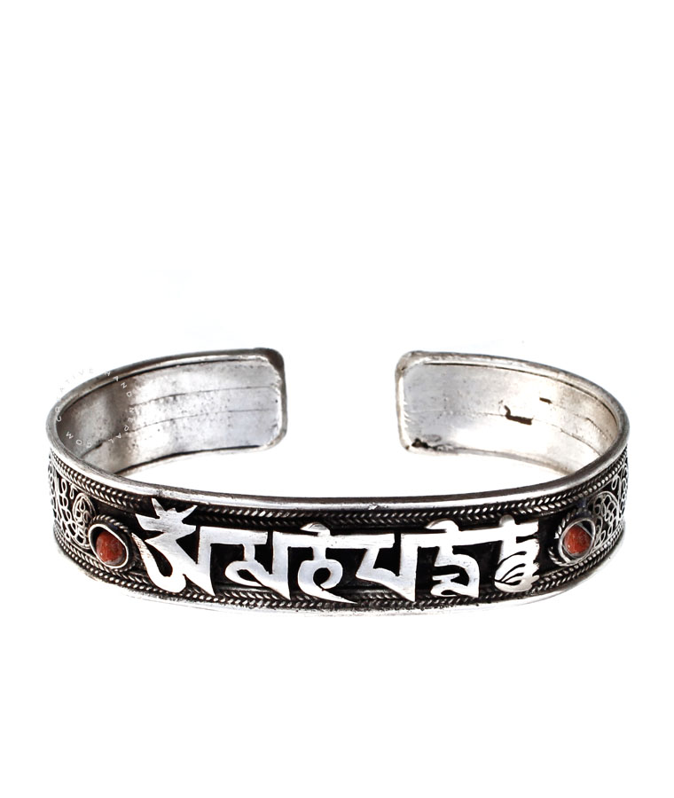 Tibetan  Mantra "Om Mani Padme Hum" at the center of the bracelet, with small Turquoise or red Coral beads and at the outside  Delicate filigree design  with all the details of a Mantra art work Small weaving designs at the top and bottom .This Bracelet is handcrafted in Nepal using traditional tools and techniques. Handmade organic defects in finish add to the artistic character of the piece .Please note that each bracelet is unique and stones cannot be specified. Approx 1.5 cm Height & 18 cm around.