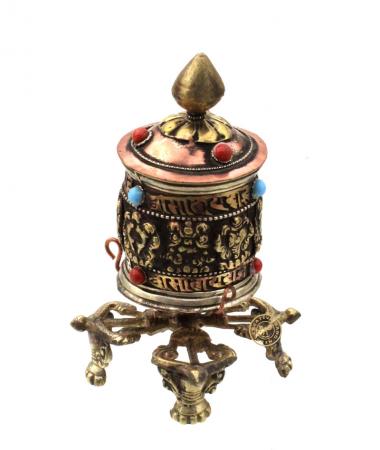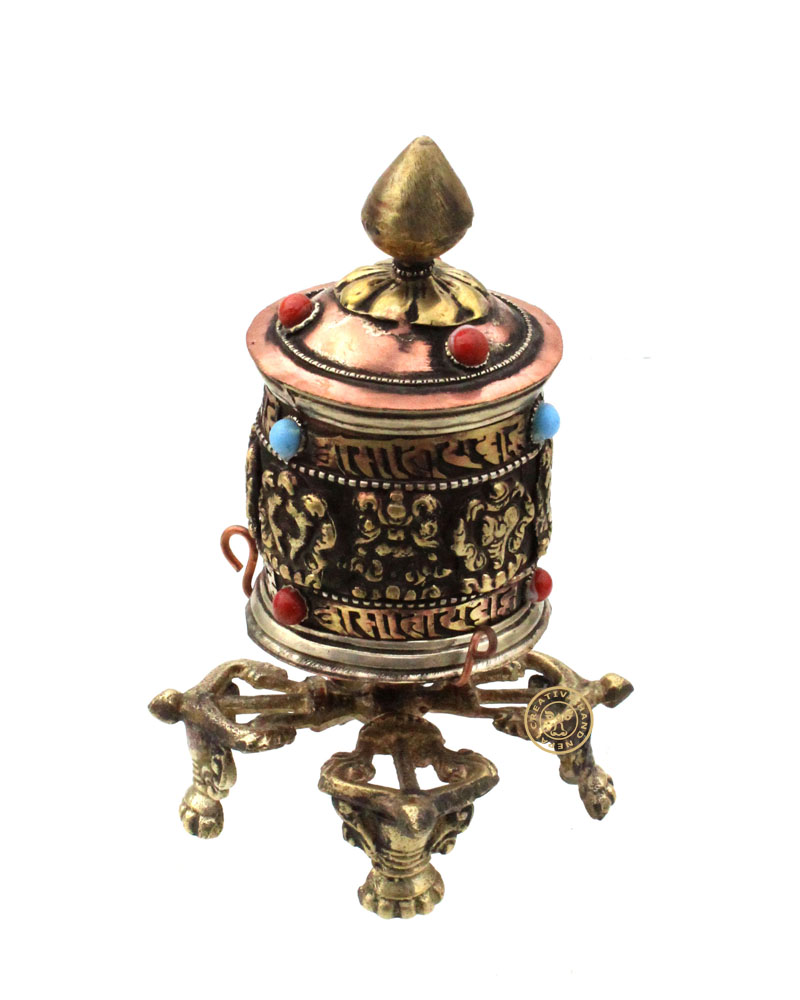 This is a Decorative Tibetan Buddhist Table Top prayer wheel. It is made from copper & Brass . This beautiful table top prayer wheel is filled with Tibetan Mantras. Simply place it on the corner of your desk and spin it in your idle moments.This desk Top prayer wheel is Approx. 4" tall, pedastal base is " wide, and the wheel weighs 13 cm Round Head.