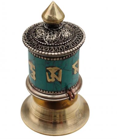 Tibetan Prayer Wheel, a sacred tool for prayer and spiritual transformation. Inspired by ancient Buddhist traditions, this handheld or tabletop wheel contains sacred mantras and prayers inscribed on a rotating cylinder. As you spin the wheel clockwise, it is believed to generate positive energy, purify negative karma, and invoke blessings. The rhythmic motion of the prayer wheel serves as a meditation practice, helping to calm the mind and deepen spiritual connection. Whether used for personal prayer, meditation, or as a decorative item, the Tibetan Prayer Wheel offers a pathway to inner peace and spiritual growth.These Turquoise Om Table Prayer Wheel are hand-made in Nepal by skilled Himalayan artisans, so each set is unique.Approx Size 4 inch Height and 2 inch Diameter