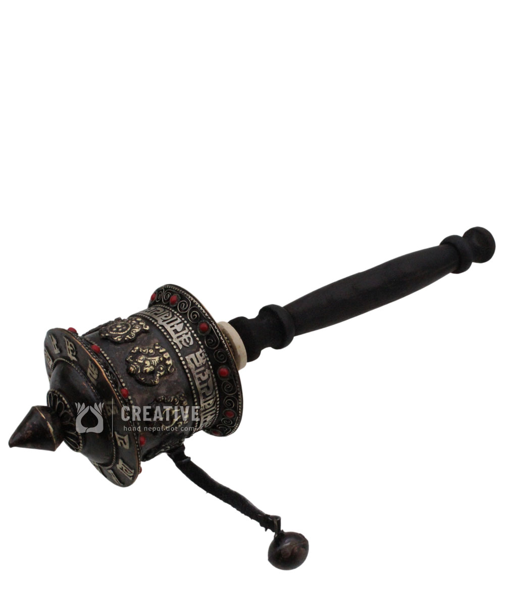 This is a beautiful Tibetan Buddhist Hand Held Prayer Wheel The Tibetan Buddhist Symbol is carved on the outside of this prayer wheel, Sacred Buddhist mantras are written on a long roll of paper kept inside this wheel. This roll of mantras rotates with each rotation of this wheel. With every rotation of wheel, these mantras are believed to be recited once.There are slight variations to design on each. Dimensions: 11 inch Height x 3 inch Width x 4 inch Depth