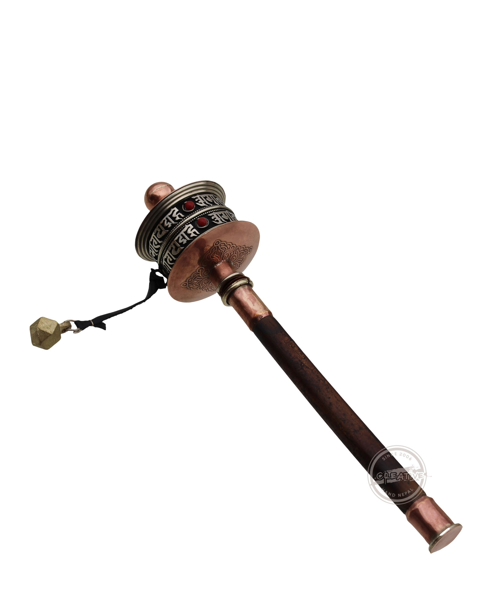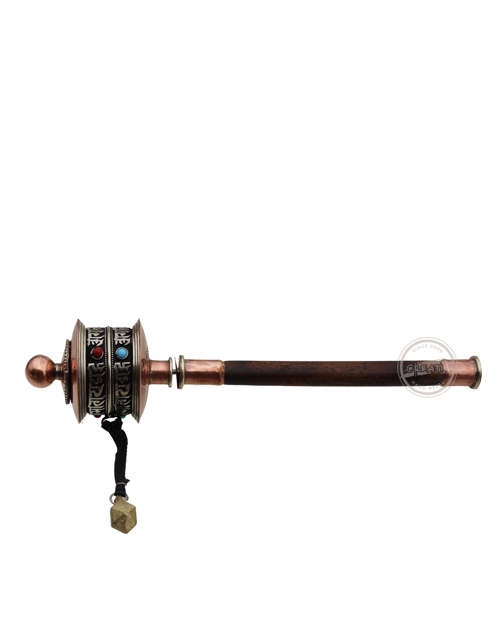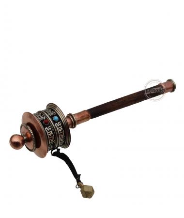 Discover tranquility in motion with our copper prayer wheel. Featuring a two-line Newari script mantra 'Om Mani Padme Hum' and embellished with stone beads, the wooden handle adds an artisan touch.Inside are scrolls containing mantras and prayers which multiply with each turn. Prayer wheel measures approximately 8 inches long and is 2 inches in diameter.