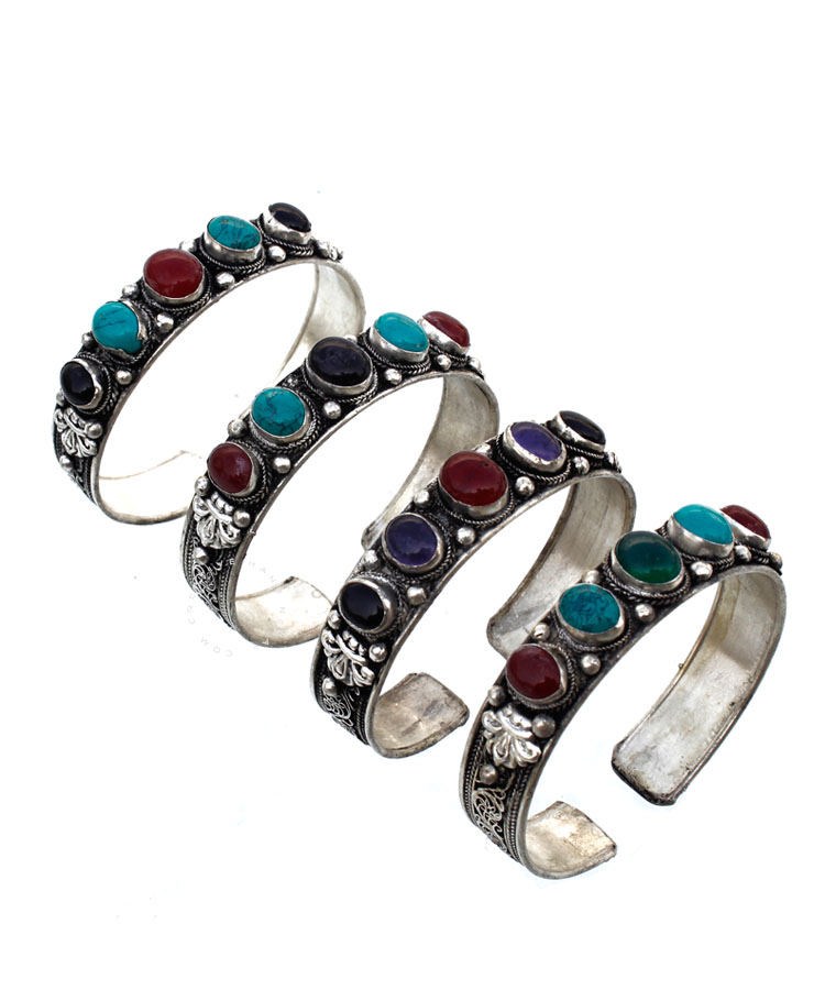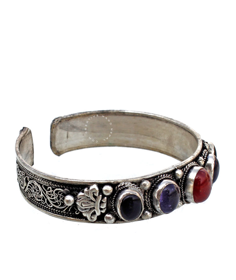 Stone With Filigree Works Bracelet . They are attractive, adjustable and functional.This enchanting design is handcrafted in Nepal using traditional tools and techniques.Handmade organic defects in finish add to the artistic character of the piece. Please note that each bracelet is unique and stones cannot be specified. Approx  0.5 cm Height & 21 cm around.