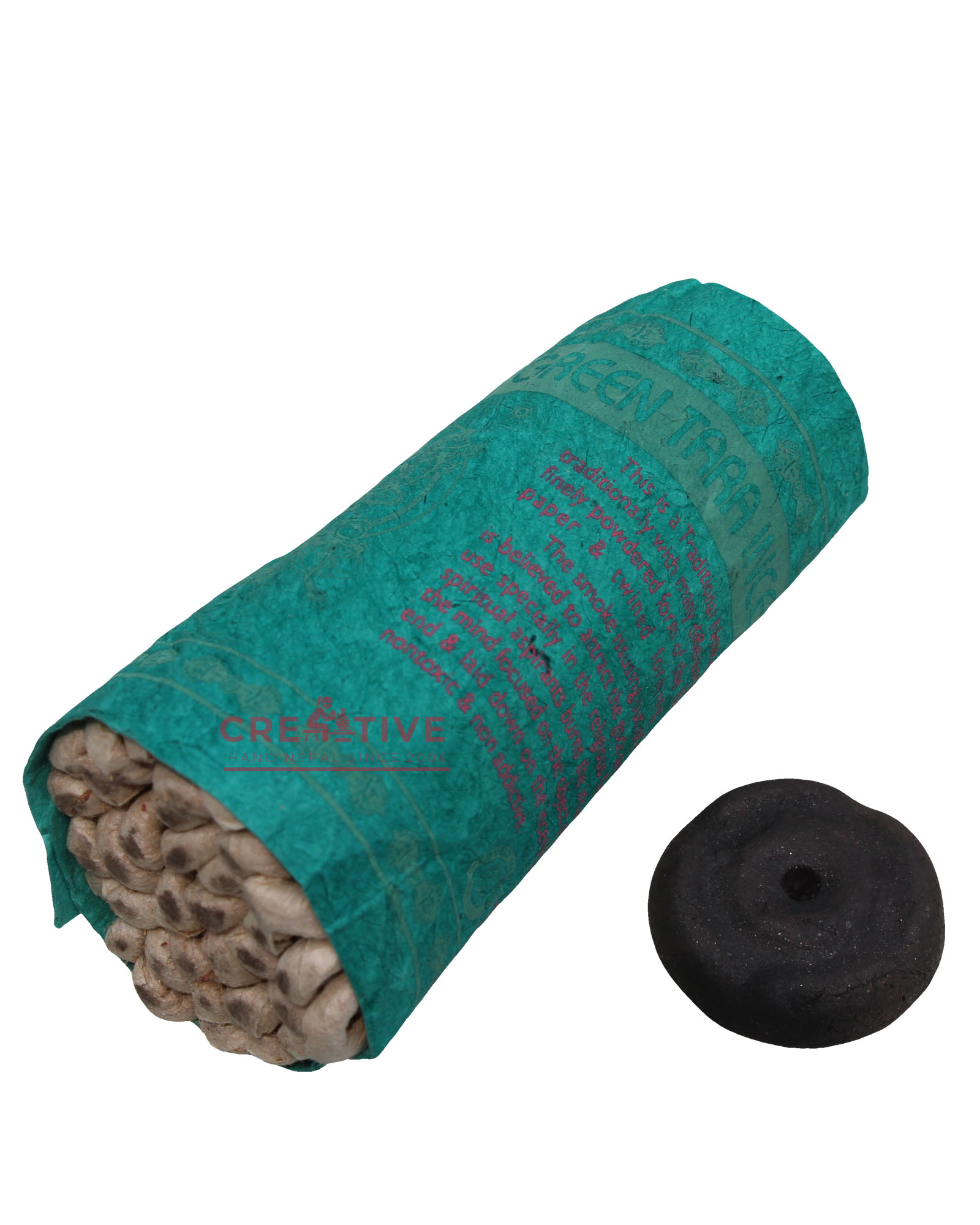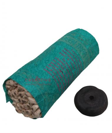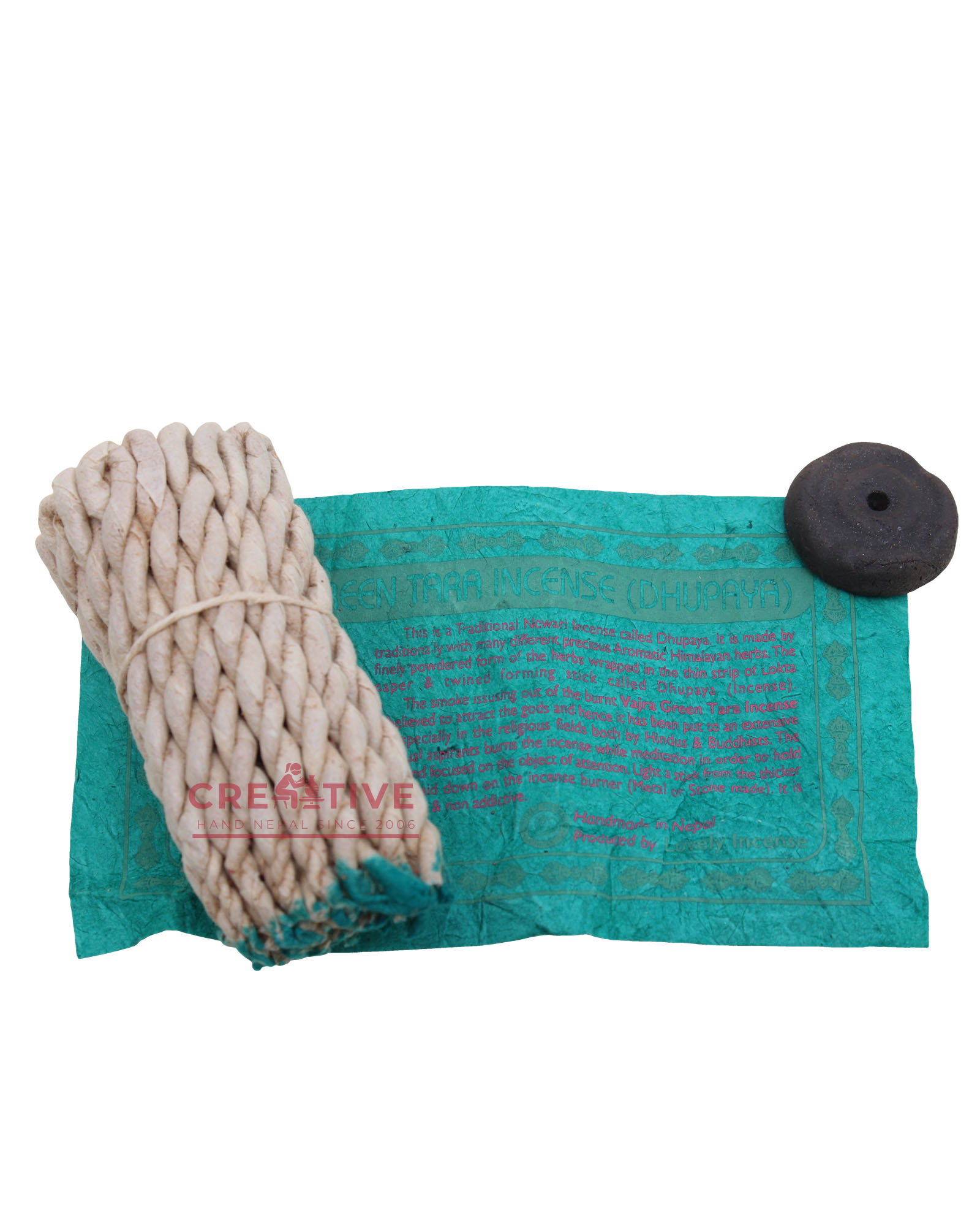 This is a traditional Newari incense known as Dhupaya, made using a variety of precious aromatic Himalayan herbs. The finely powdered herbs are wrapped in thin strips of Lokta paper and twisted into rope-like sticks, forming what is known as Dhupaya. The smoke from the burned Vajra Green Tara Incense is believed to attract divine energies and has been extensively used in religious rituals by both Hindus and Buddhists. Spiritual practitioners often burn this incense during meditation to aid concentration and to create a purified, focused environment. To use, light the thicker end of the rope and place it flat on a stone or metal incense burner. This incense is nontoxic and non-addictive, making it suitable for regular spiritual use.