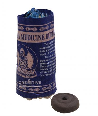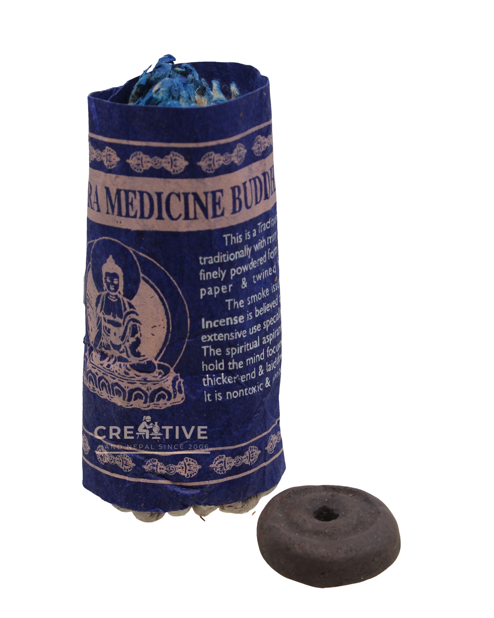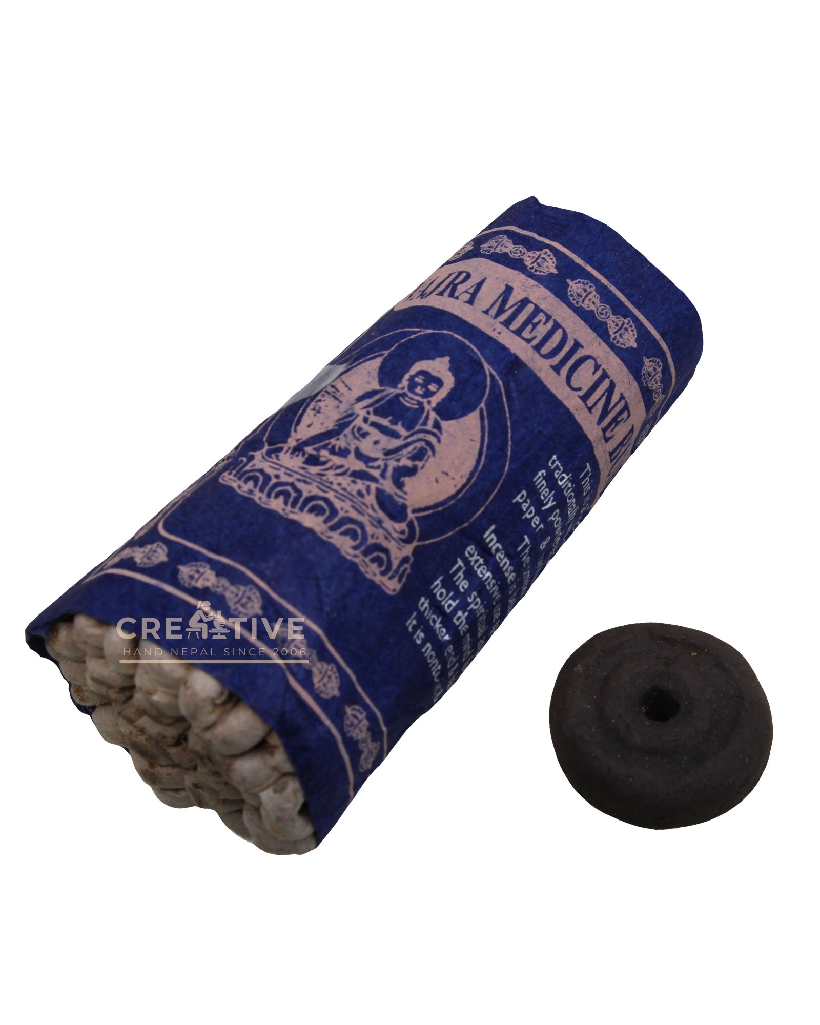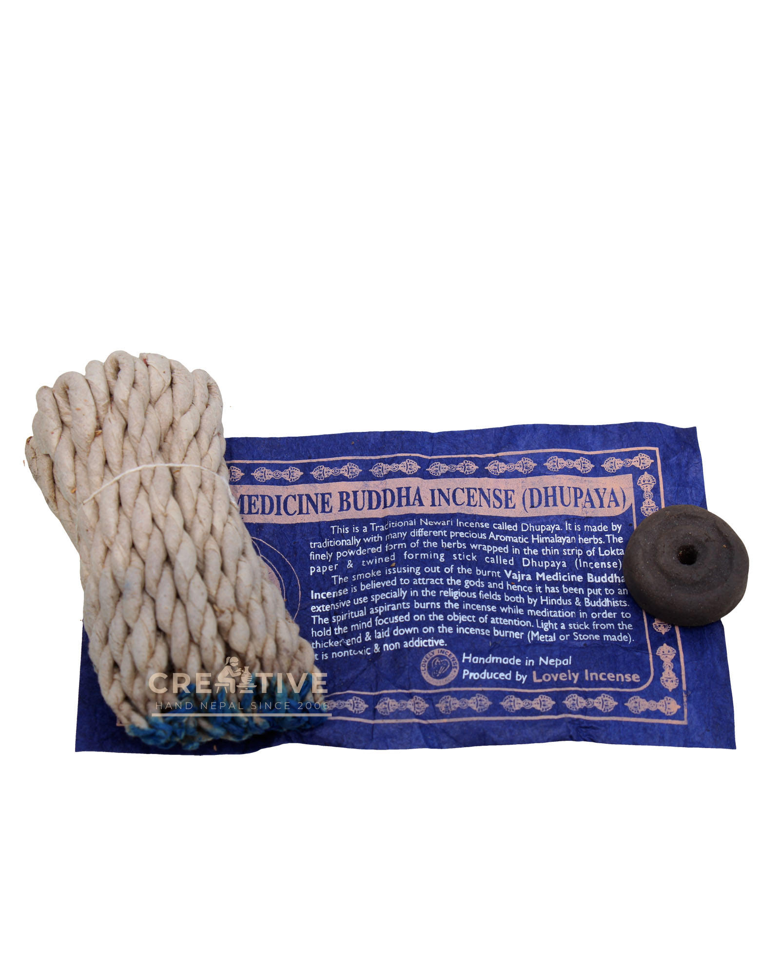 This is a traditional Newari incense known as Dhupaya, made using a variety of precious aromatic Himalayan herbs. The finely powdered herbs are wrapped in thin strips of Lokta paper and twisted into rope-like sticks, forming what is known as Dhupaya. The smoke from the burned Vajra Medicine Buddha Incense is believed to attract divine energies and has been extensively used in religious rituals by both Hindus and Buddhists. Spiritual practitioners often burn this incense during meditation to aid concentration and to create a purified, focused environment. To use, light the thicker end of the rope and place it flat on a stone or metal incense burner. This incense is nontoxic and non-addictive, making it suitable for regular spiritual use.