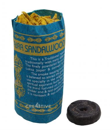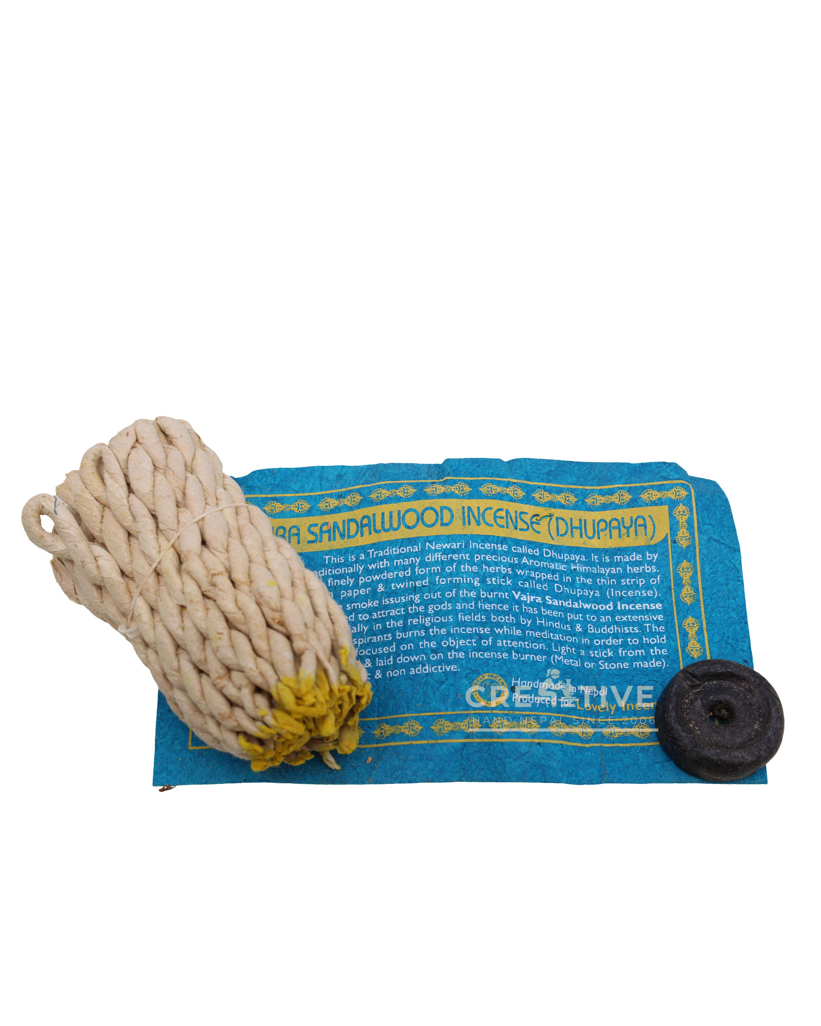 This is a traditional Newari incense known as Dhupaya, made using a variety of precious aromatic Himalayan herbs. The finely powdered herbs are wrapped in thin strips of Lokta paper and twisted into rope-like sticks, forming what is known as Dhupaya. The smoke from the burned Vajra Sandalwood Incense is believed to attract divine energies and has been extensively used in religious rituals by both Hindus and Buddhists. Spiritual practitioners often burn this incense during meditation to aid concentration and to create a purified, focused environment. To use, light the thicker end of the rope and place it flat on a stone or metal incense burner. This incense is nontoxic and non-addictive, making it suitable for regular spiritual use.